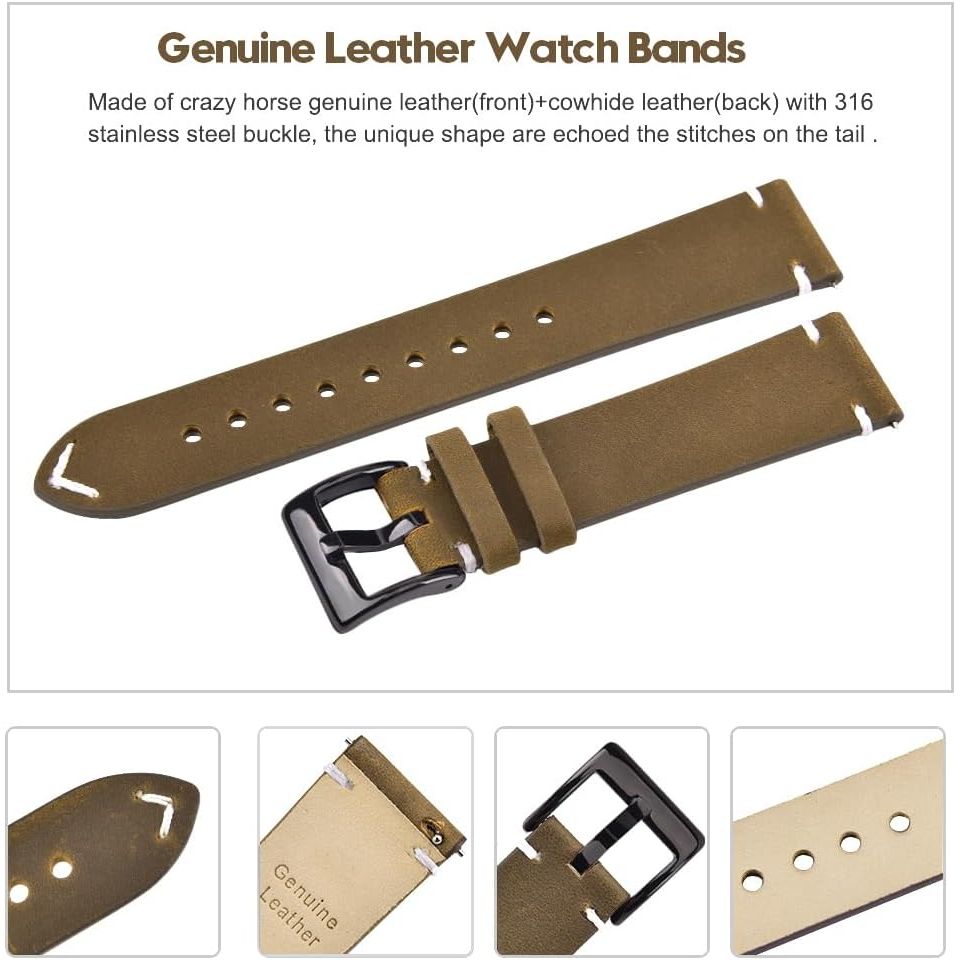 • WATCH BAND MATERIAL: Hand made genuine vintage leather watch strap, quick release spring bars, durable leather, solid tang 316L stainless steel buckle.
