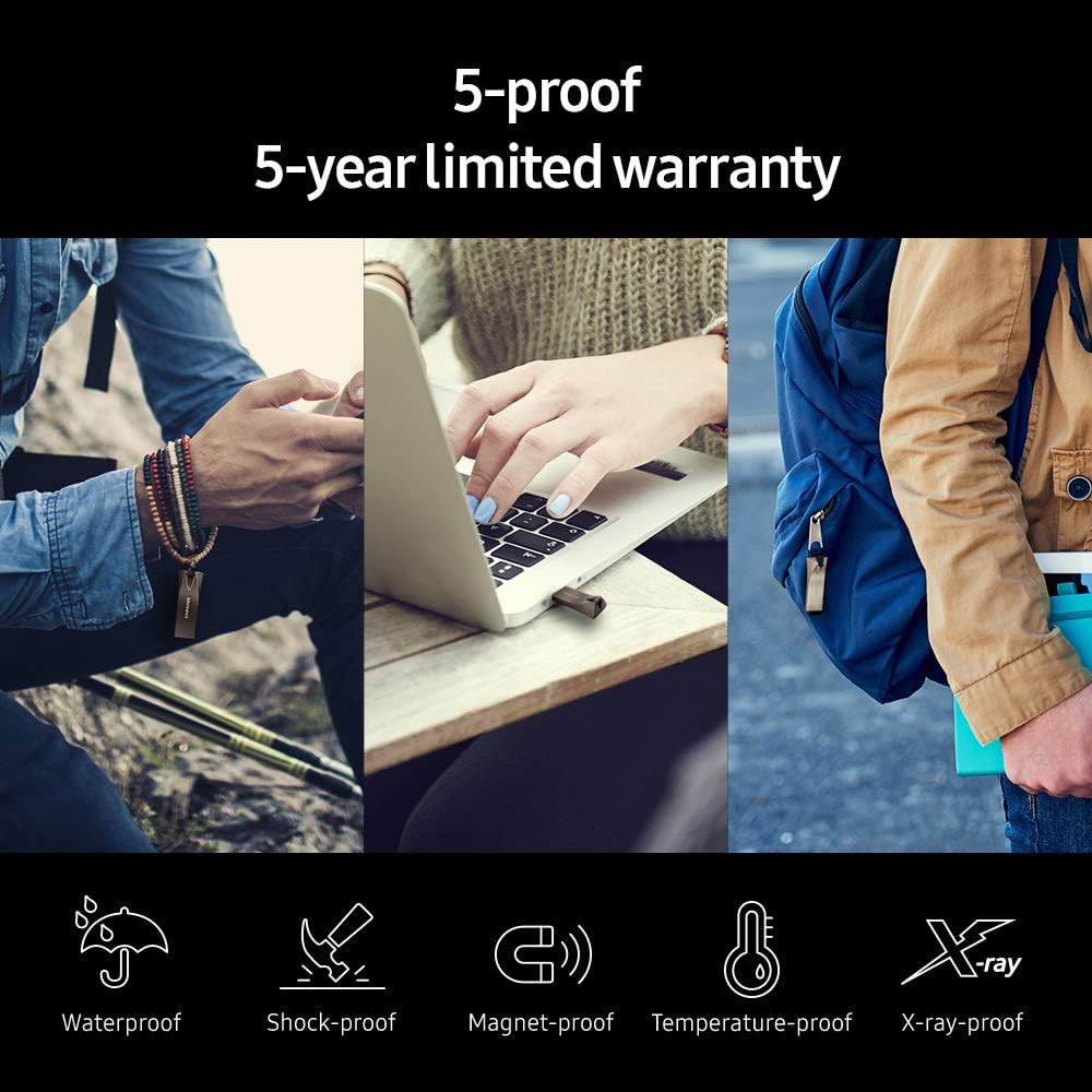 A modern take on a classic. The next generation Bar Plus elevates the flash drive to an everyday essential, offering impressive speed and striking design. Fit to your hand, the metal unibody is pure minimalism in a drive that cleverly blends style, speed, and reliability. *Up to 300 MB/s for 256/128GB models; up to 200 MB/s for 64/32GB models. **Minimum of 10 secs for 256/128GB models; minimum of 14 secs for 64/32GB models (tested with combination of Asus Z370-G, Intel i7-8700K@3.70GHz, 8GB DDR4 and Windows 10 Enterprise 64bit). ***Up to 72 hrs in seawater. Up to 1,500 gravitational acceleration. Withstands -25°C to 85°C operating, -40°C to 85°C non-operating. Up to 15,000 gauss (equal to MRI). Up to 50 Roentgen (equal to airport X-ray machines). Samsung is not liable for any damages and/or loss of data or expenses incurred due to UFD data recovery. For specific details on warranty, please visit: www.samsung.com/support. ****Source: 2003-2019 IHS Markit data: NAND suppliers' revenue market share.