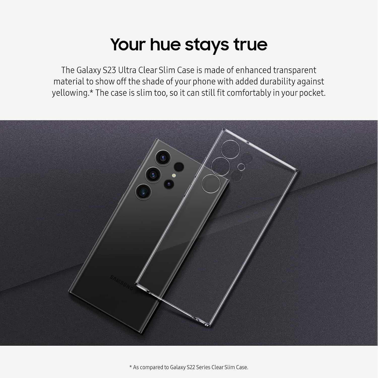 - YOUR HUE STAYS TRUE: The Galaxy S23 Ultra Clear Slim Case is made of enhanced transparent material to show off the shade of your phone with added durability against yellowing; The case is slim too, so it can still fit comfortably in your pocket