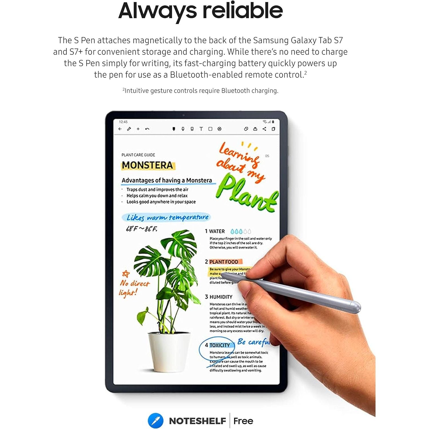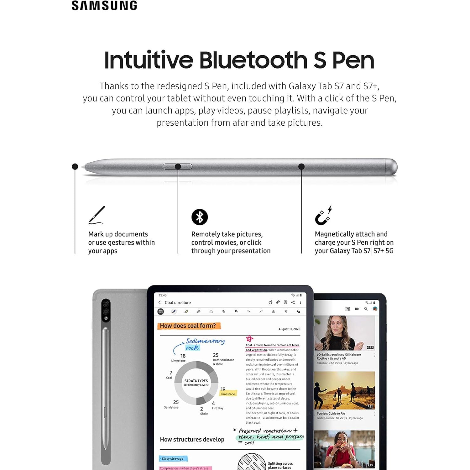 - INTUITIVE BLUETOOTH S PEN: Thanks to the redesigned S Pen, included with Galaxy Tab S7 and S7+, you can control your tablet without even touching it. With a click of the S Pen, you can launch apps, play videos, pause playlists, navigate your presentation from afar and take pictures.