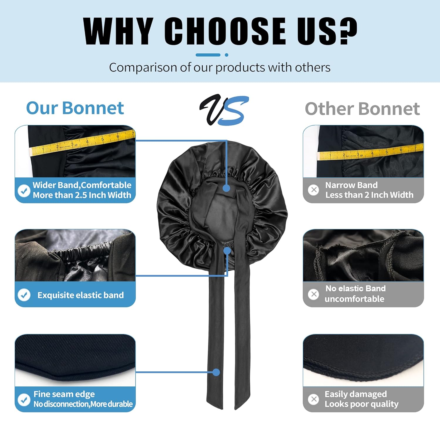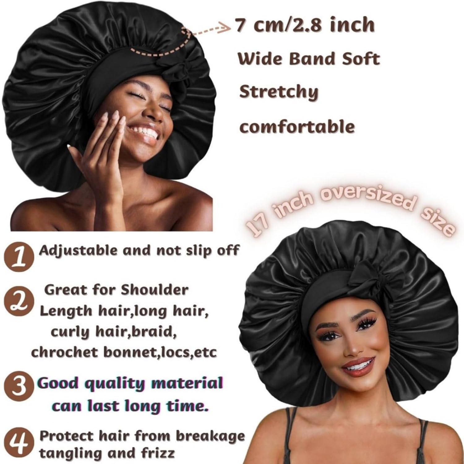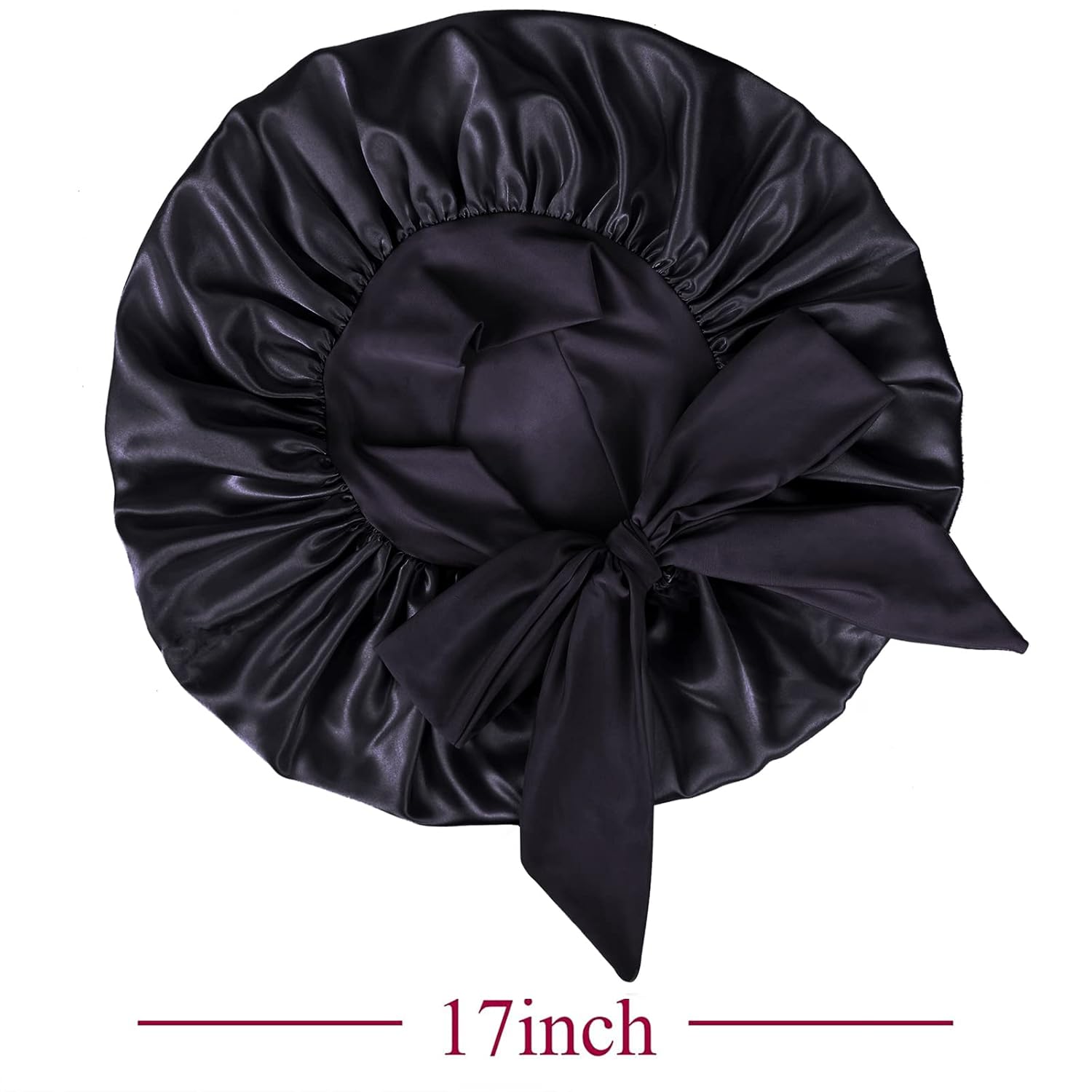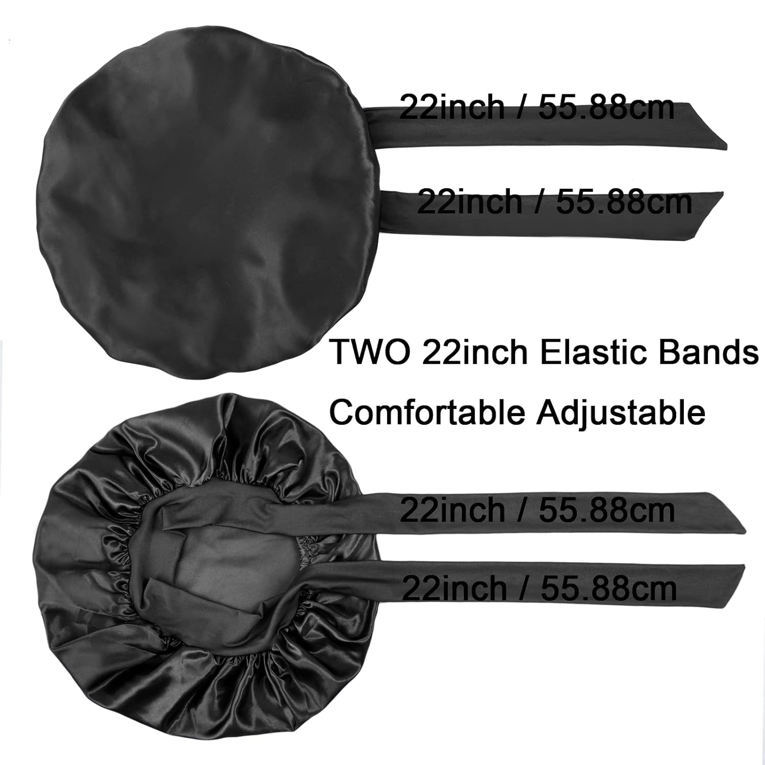- Satin Bonnet Silk for Hair Sleeping: Women Tie Bonnets Adjustable Night Cap Jumbo Size Comfortable Wide Band for Braids Curly Long Hair (Black)