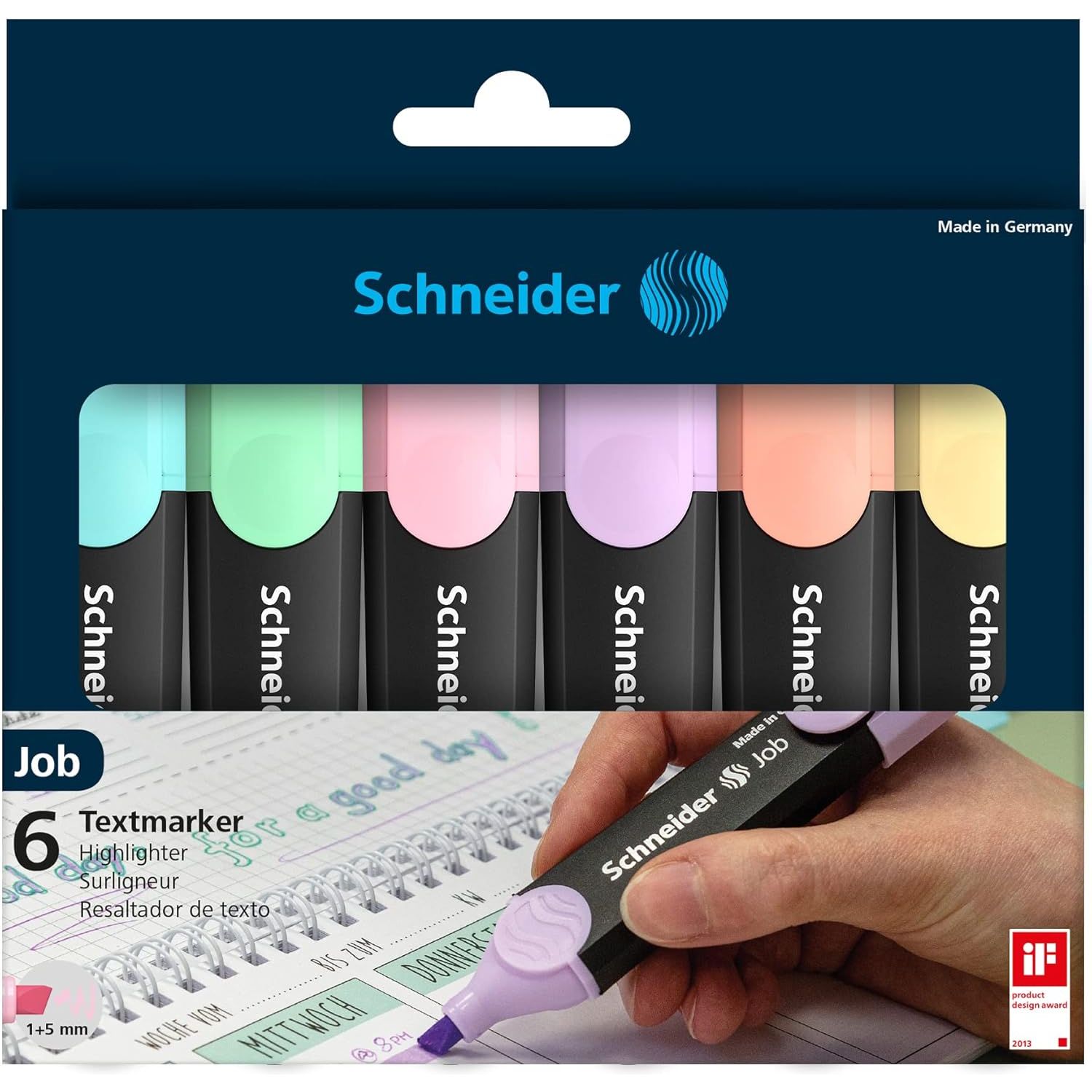 The Schneider Job Pastel Highlighter features universal ink with brilliant performance and good lightfastness on standard, copy, and fax paper. Chisel tip highlights line widths in two sizes, approximately 1 mm and 5 mm, ideal for creative work, school, or office use. The anti-evaporation polypropylene barrel is guaranteed to keep the highlighter fresh for two years. The slimmer shape with rounded edges is perfect for a pocket or pencil case. The cap with a practical, sturdy clip fits neatly on either end of the barrel. With its large ink reservoir, the Job Highlighter can highlight more than 15,000 words. The smart highlighter was awarded the renowned iF and red dot design awards. Includes reusable wallet with six (6) pastel highlighters: turquoise, mint, lavender, light pink, peach and vanilla. Made in Germany, Schneider products are manufactured to the highest quality and environmental standards that have earned awards and accolades across the company's 80+ year history. Known for reliability, functionality and sustainability, Schneider Writing Instruments are available at excellent price points to empower creativity and pen to paper. Each thought is worth writing down - the Schneider way.