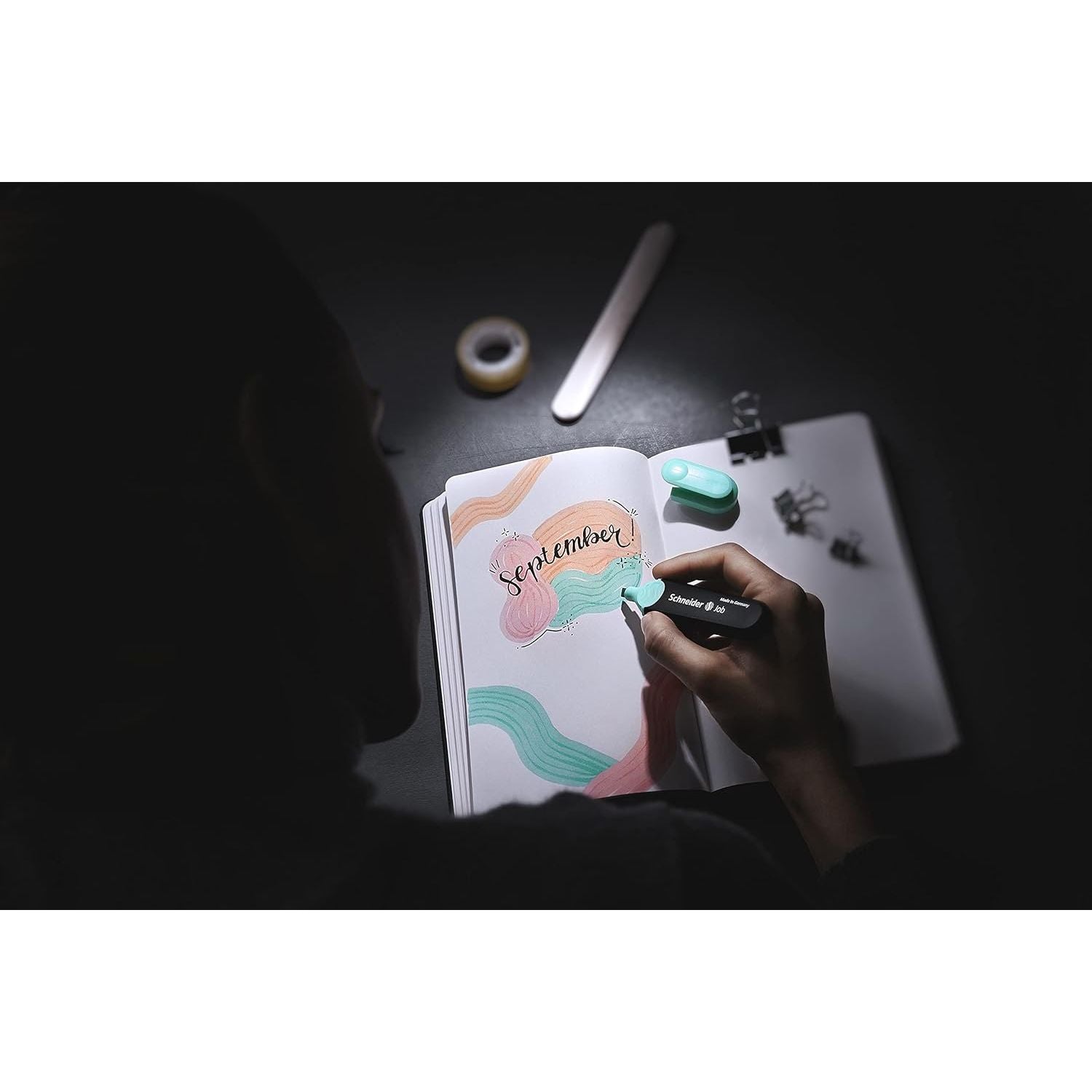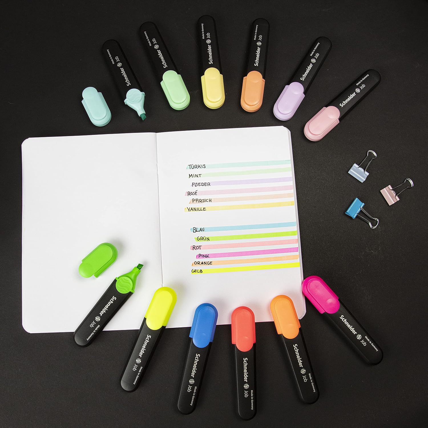 - Schneider Job Highlighter Pastel, Chisel Tip, 1 + 5 mm, Black Barrel, Assorted Ink Colors, Pack of 6 Highlighters: Turquoise, Mint, Vanilla, Peach, Lavender, Light Pink (115097)