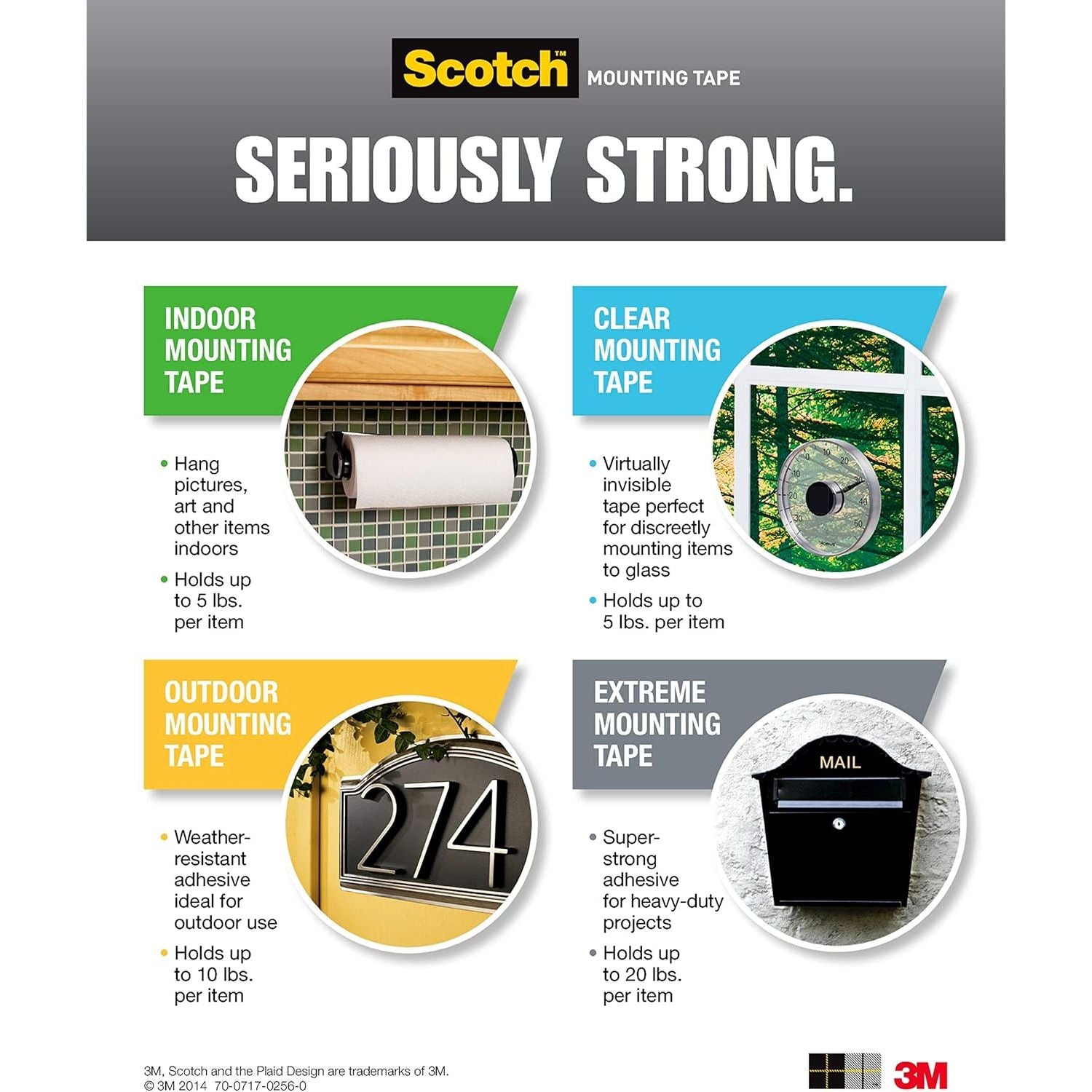 - Scotch Mounting, Fastening & Surface Protection Permanent Clear Mounting Tape, holds up to 2 pounds, 1" x 60", 1 Roll, Model:4010