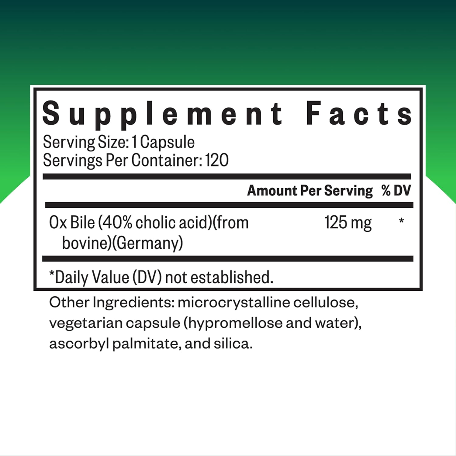 - Effective and targeted: Ox Bile 125 provides 125 mg of pure bile from free-range oxen (bovine), and contains 40% cholic acid for dietary fat digestion support, and healthy balance of small intestinal bacteria to aid a healthy digestive process.