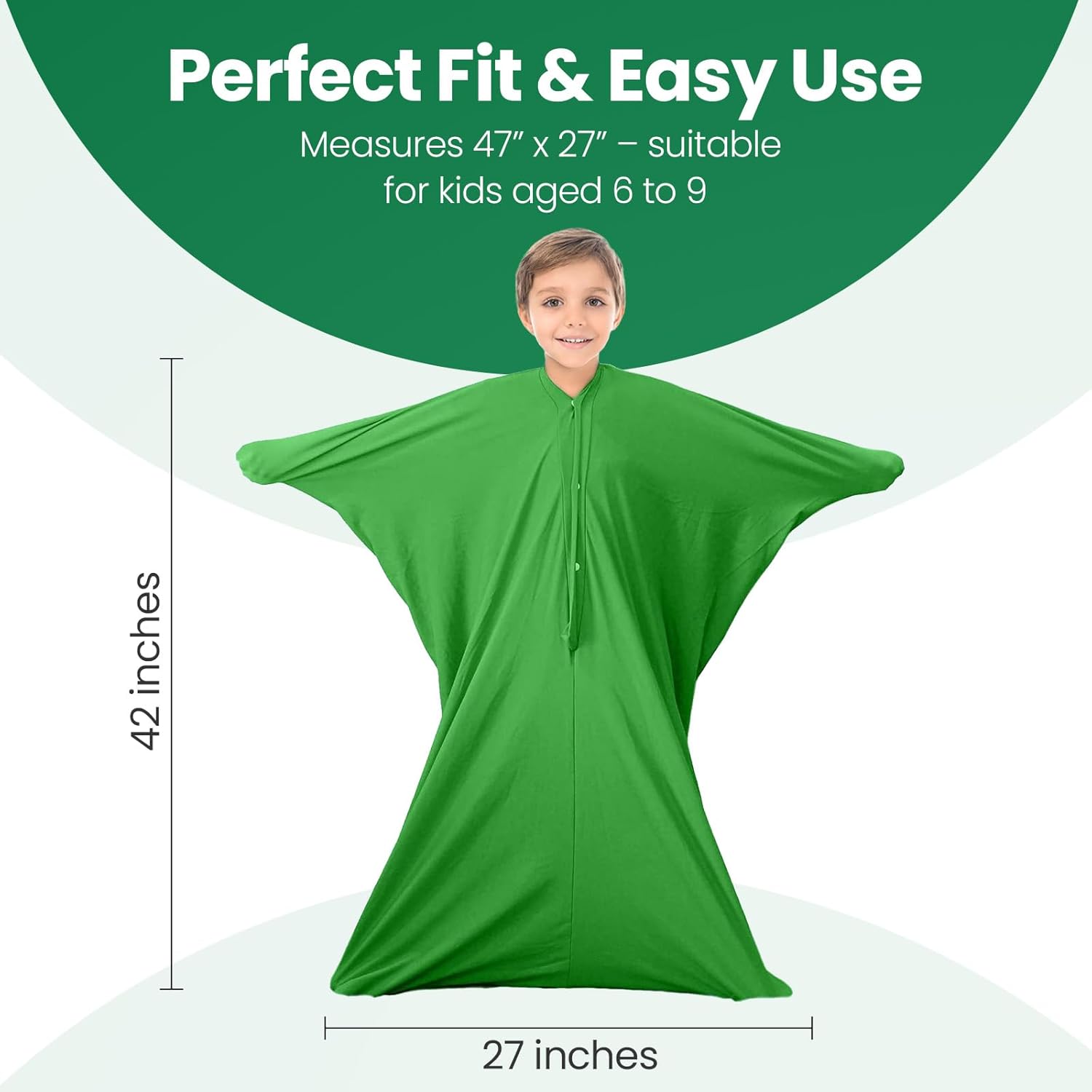 - COMFORTABLE SENSORY EXPERIENCE: Our body sacks are made from stretchy material for limited, yet comfortable movement. It’s 80% nylon and 20% spandex. Unlike other body pods that use scratchy velcro, our body socks use snap closures. Snaps ensure easier removal. The sack measures 47 inches in length and 27 inches in width. It fits most 6 to 9 year olds. It is designed to rest on the shoulders.