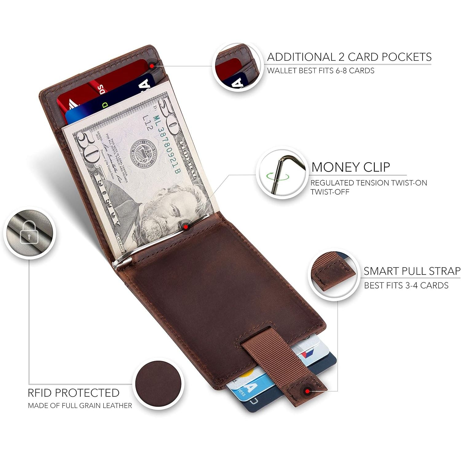 - SLIM AND STYLISH - Made with the Finest Full Grain leather, Top Grain Leather and Vegan Leather. Designed Quick Access ID Windows, Best Fits 6-8 cards plus US bills with no bulk, and a minimal Pull-tab design to reduce bulk - Wallet Size: 3.9" in. x 2.8" in. .5" in.