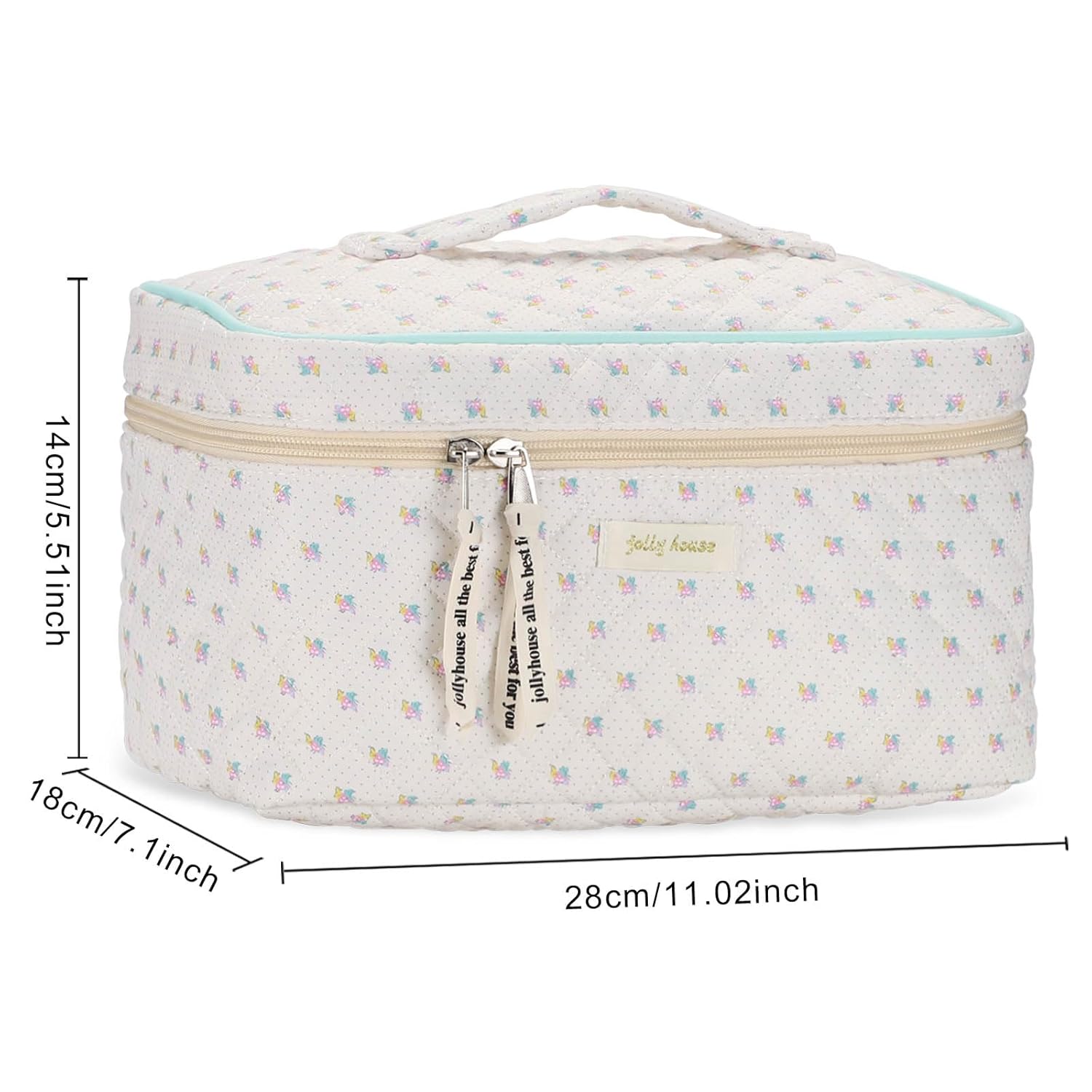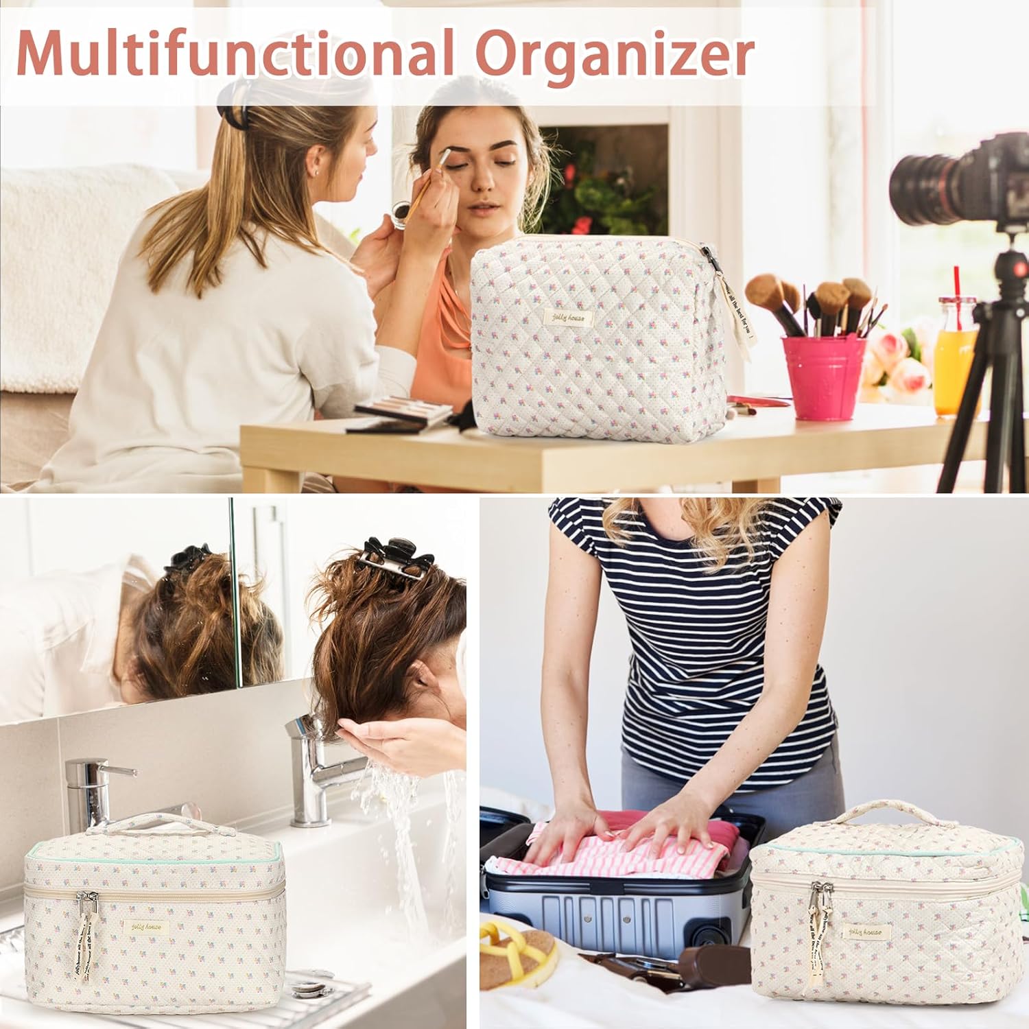 - Sightor Cotton Makeup Bag, Quilted Cosmetic Bag with Handle Large Capacity Travel Toiletry Bag for Women Cute Aesthetic Floral Makeup Bag (Beige)