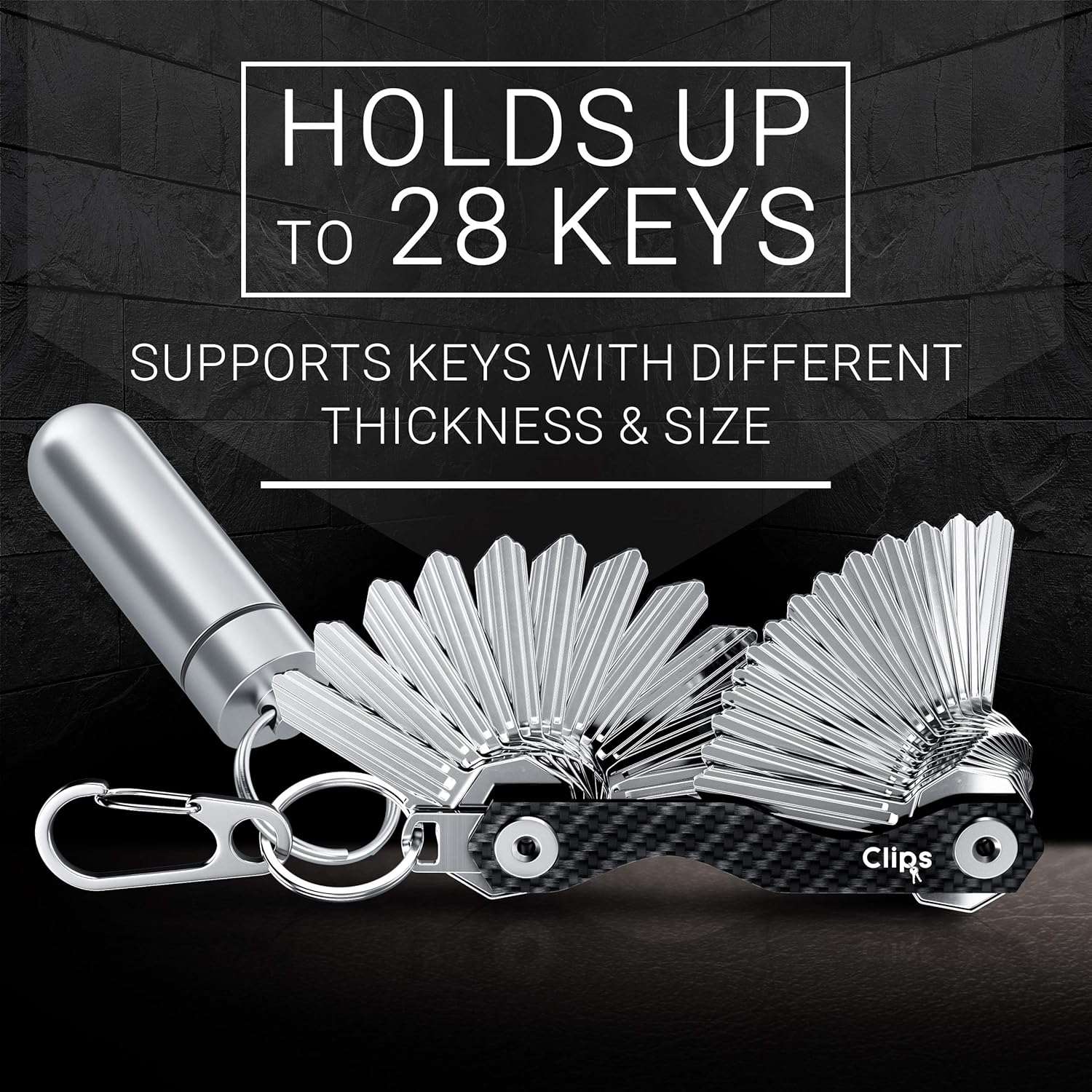 - ✅ MORE POCKET SPACE - Forget about uncomfortable pocket bulges, Clips key holder designed as a clever & compact organizer to fit perfectly in your pocket holding up 28 keys or accessories. Our smart locking mechanism set will keep your keys fixed and in position.