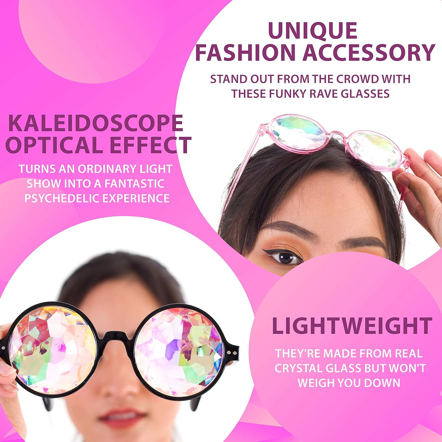 - AN ESSENTIAL ACCESSORY FOR THE RAVER: Enhance your rave and festival experiences with these premium quality kaleidoscope glasses. You'll draw lots of attention as you groove and vibe at your favorite events. A great way to stand out from the crowd!