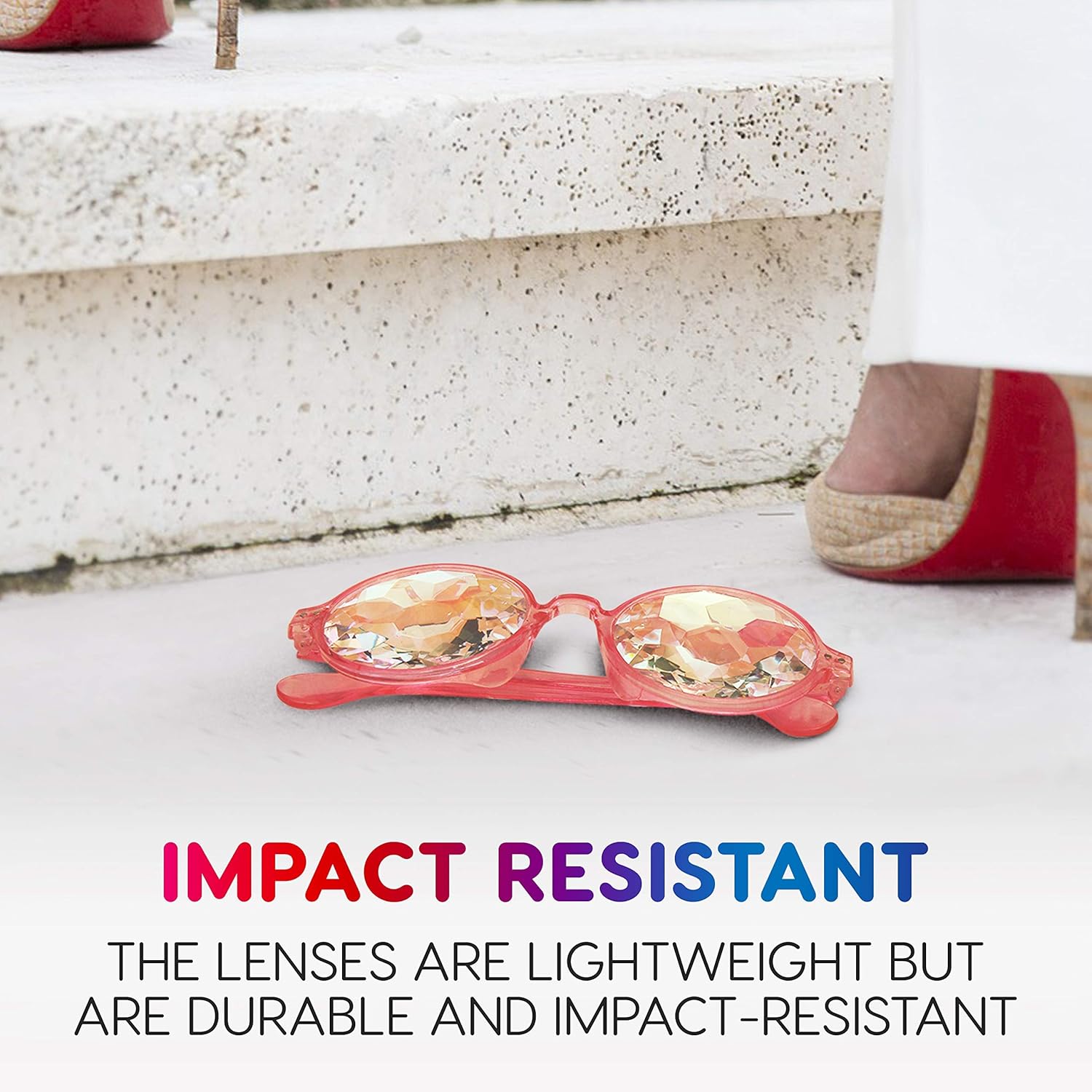 - DURABLE AND LIGHTWEIGHT: These multi-faceted crystal lenses won't weigh you down while you're getting your dance on. They're lightweight but sturdy and impact-resistant and provide optimal light diffusion to create a rainbow effect for the wearer.