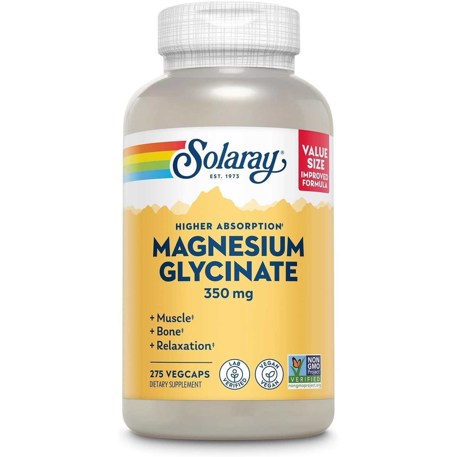 - SOLARAY Magnesium Glycinate Capsules, Chelated Magnesium Bisglycinate w/BioPerine, Higher Absorption Magnesium Supplement - Bones, Muscles, Heart Support, Vegan (30 Servings, 120 VegCaps)