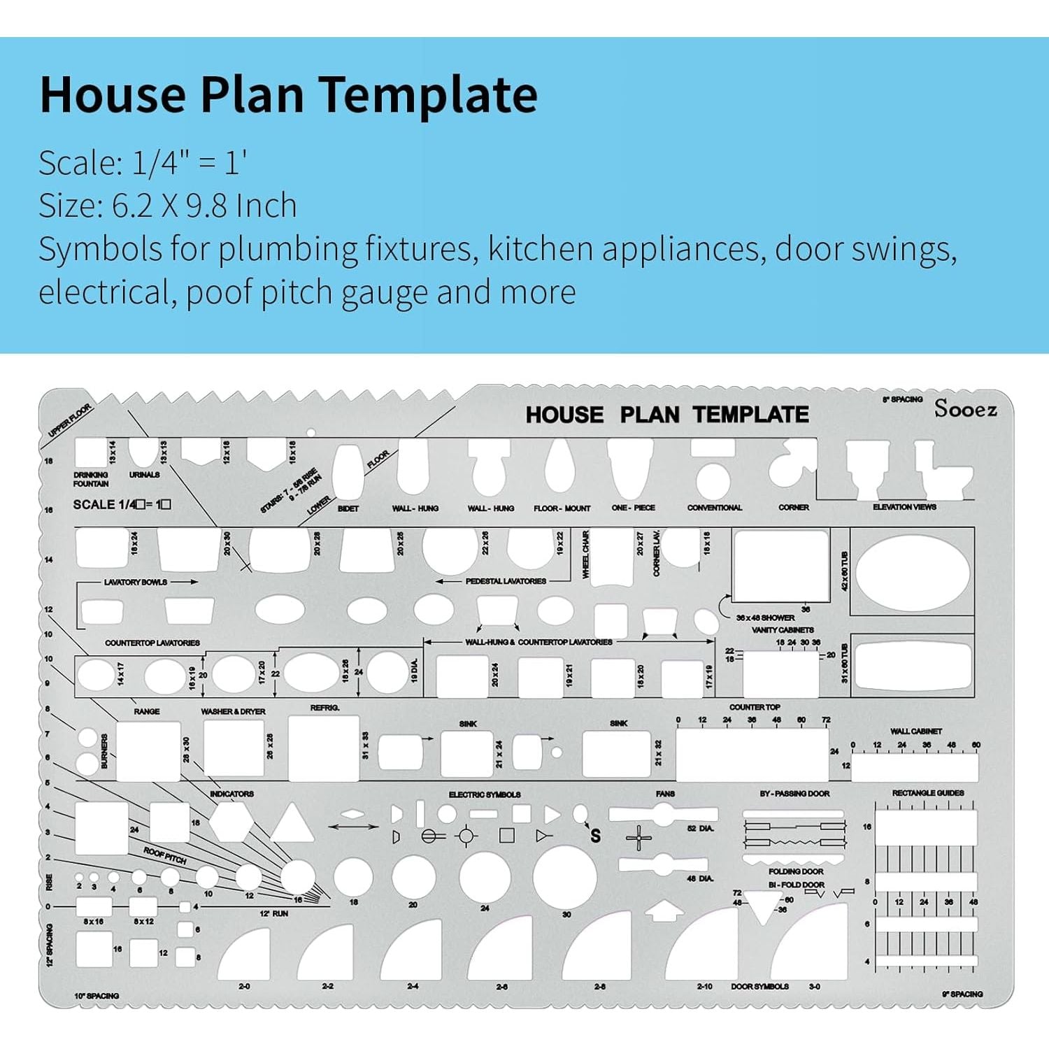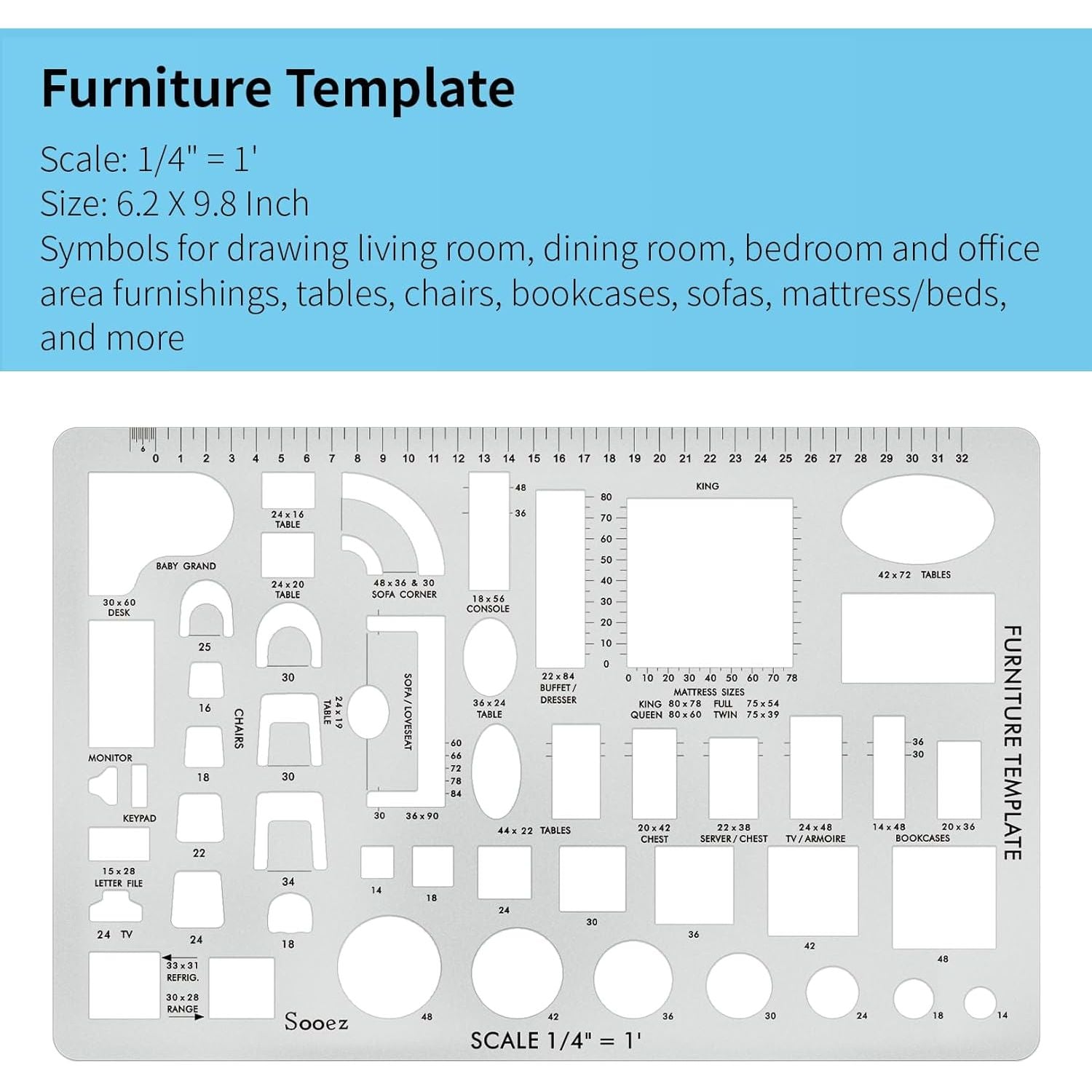 To Help you Complete your Planning with our Architect Drawing Template Set, Exceptional Accuracy and Ease 3PCS Architectural Templates Included: House Plan Template: Scale: 1/4" = 1' Size: 6.2 X 9.8 Inch Transparent clear flexible plastic Symbols for plumbing fixtures, kitchen appliances, door swings, electrical, poof pitch gauge and more Furniture Template: Scale: 1/4" = 1' Size: 6.2 X 9.8 Inch Transparent clear flexible plastic Symbols for drawing living room, dining room, bedroom and office area furnishings, tables, chairs, bookcases, sofas, mattress/beds, and more Kitchen, Bed & Bath Template: Scale: 1/4" = 1' Size: 8.5 X 11 Inch Transparent clear flexible plastic Symbols for cabinets, appliances, beds, and dressers and more Multiple Functions: Specially designed for Architects, Builders, Contractors and more