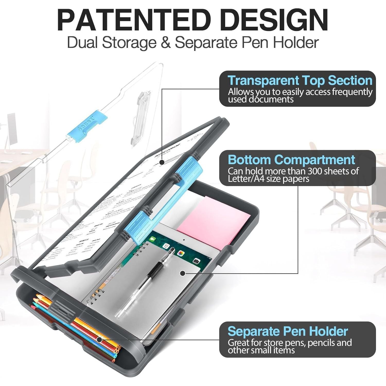 - [Patented Design] Dual Storage & Separate Pen Holder: Pattened dual-Layer design along with the pen/pencil case ensure roomy space for various needs of storage. Keep frequently used documents on the top compartment and store more than 300 sheets in the spacious bottom compartment. Separate pen/pencil case for pens, pencils, markers, clips and other small items.