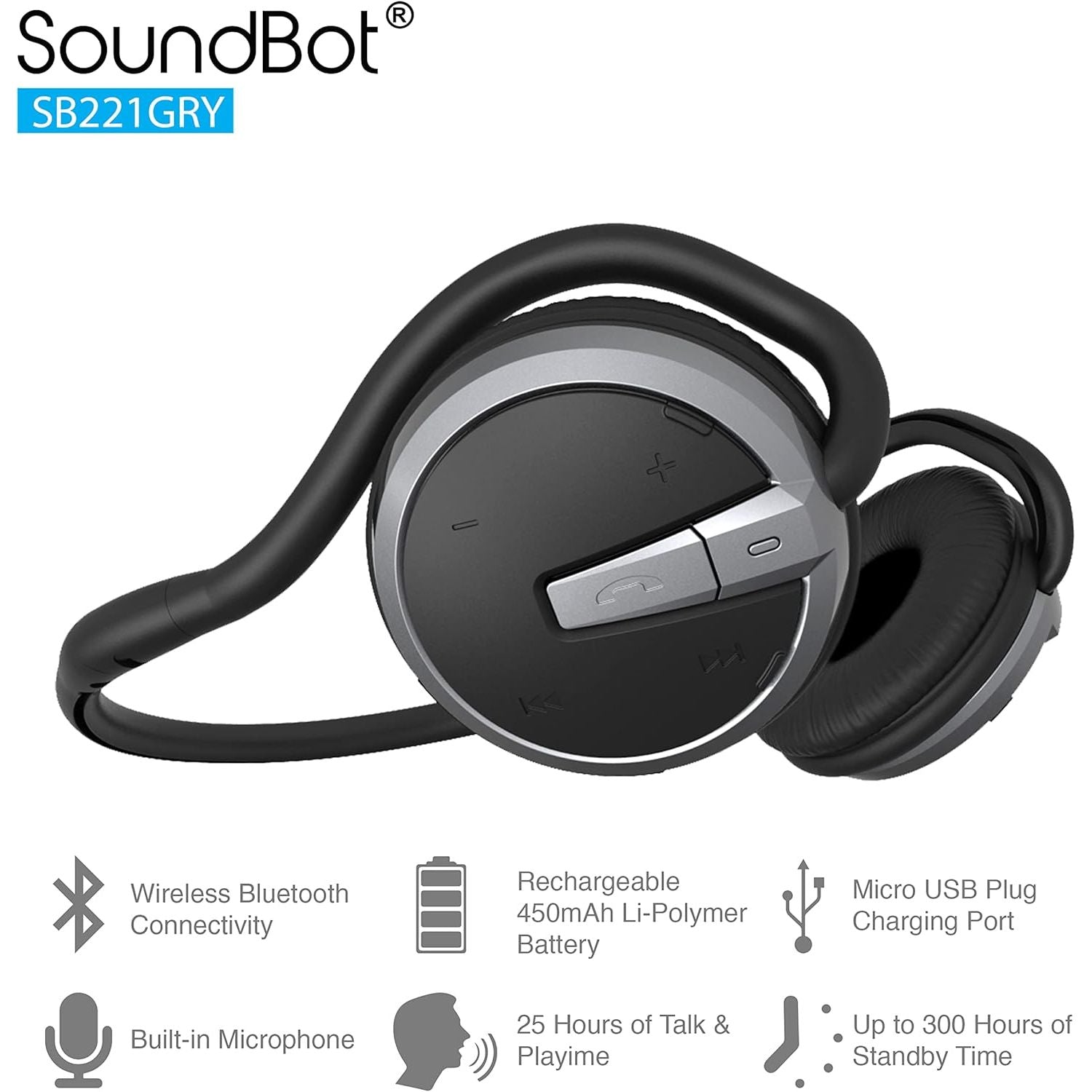 Features ergonomic behind the ear and neck human engineering frame design that securely fits and comfortably sits over the ear/neck for both indoor and sports-active outdoor use from to up 33 feet of remote distance. Fit for head size 6 3/4 to 8, 21 1/4" to 25" 5 intuitive and dedicated remote control buttons that allows easy navigation and quick access to SIRI or Android voice command (only on supported phone models and operating system), call management, wireless music streaming control, and volume adjustments. Equipped with noise reduction, crystal clear audio technology, and high-performance speaker driver that reproduce and deliver natural and balanced full range music spectrum for enhanced HD listening experiences. Swivel-able earcup with ultra foldable compact water-resistant frame to provide maximum comfort and portability for everyday usage. Scratch resistant surface to prevent the headset from signs of wear and tear. Soundbot builds and engineers the product with multi-purpose functionalities to use in all different types of applications.