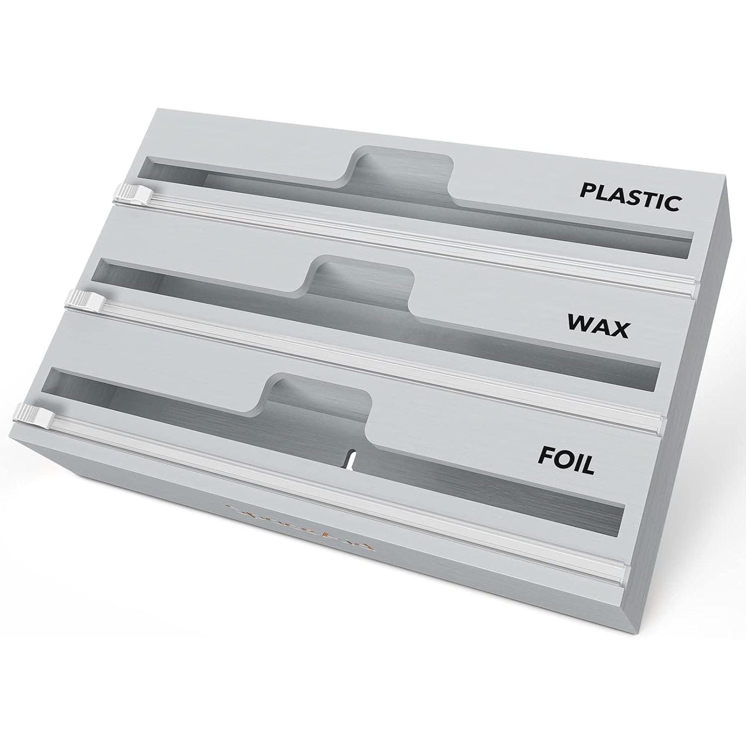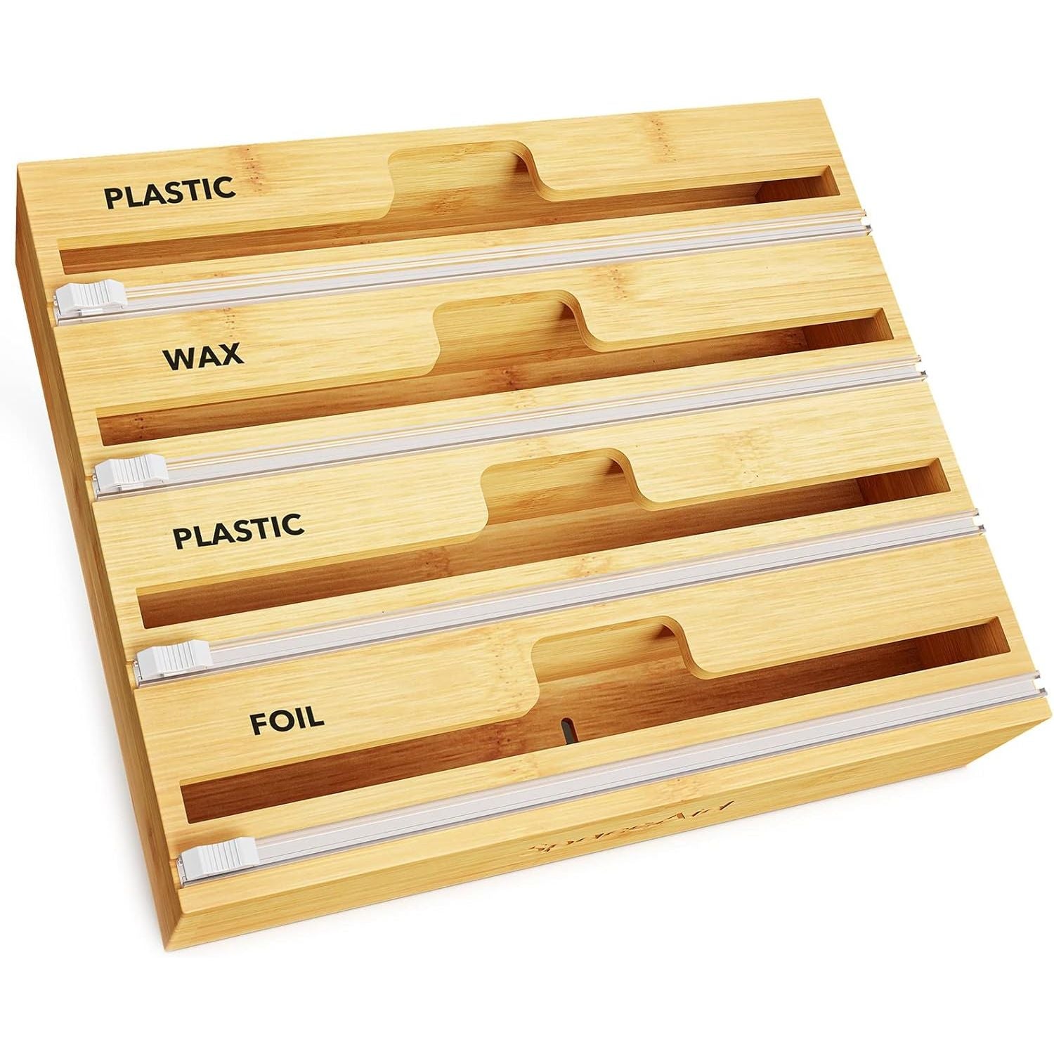 - SpaceAid WrapNeat 3 in 1 Wrap Organizer with Cutter and Labels, Plastic Wrap, Aluminum Foil and Wax Bamboo Dispenser for Kitchen Storage Organization Holder for 12" Roll (Natural)