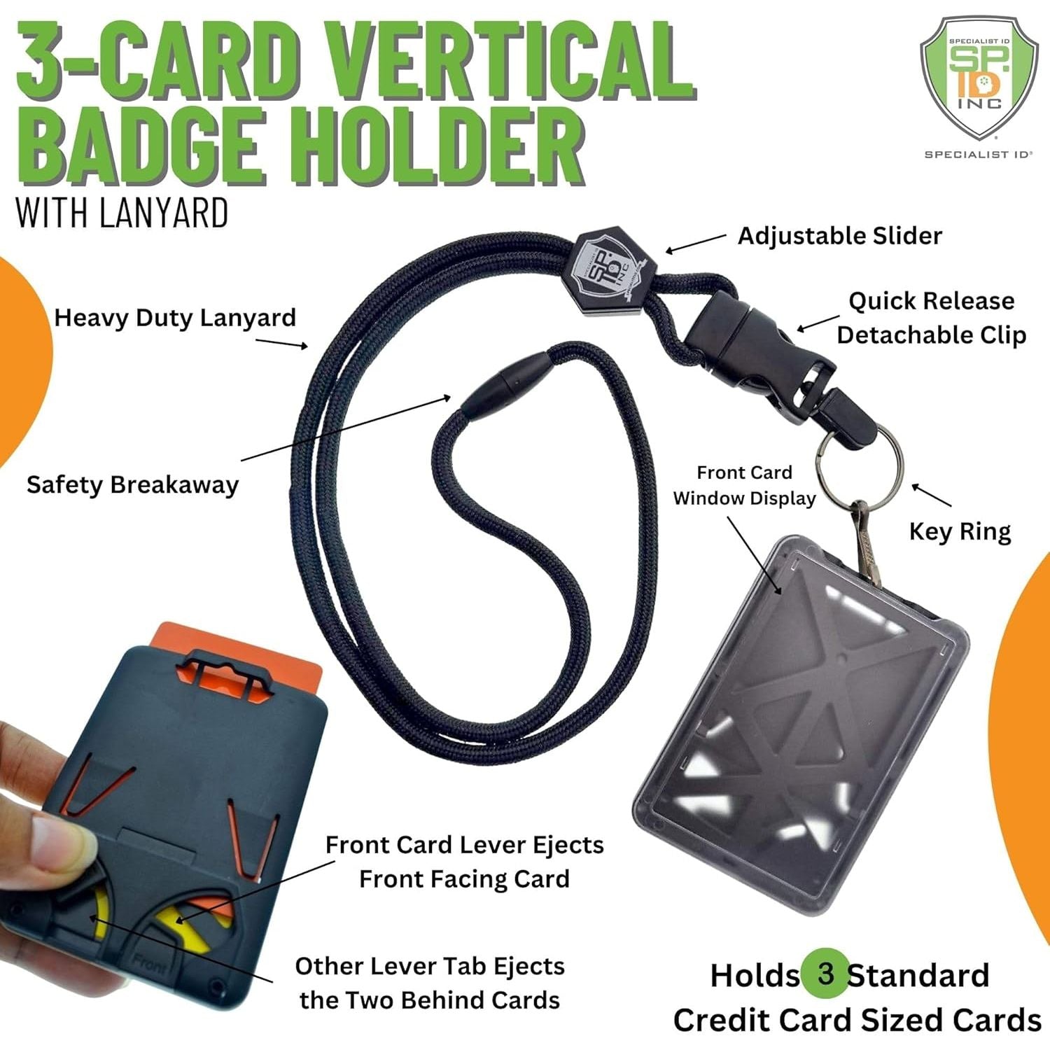 - Specialist ID Vertical Top Load Three Card Badge Holder - Hard Plastic with Heavy Duty Breakaway Lanyard w Quick Release Metal Clip & Key Ring (One Holder / 3 Cards Inside) (Black)