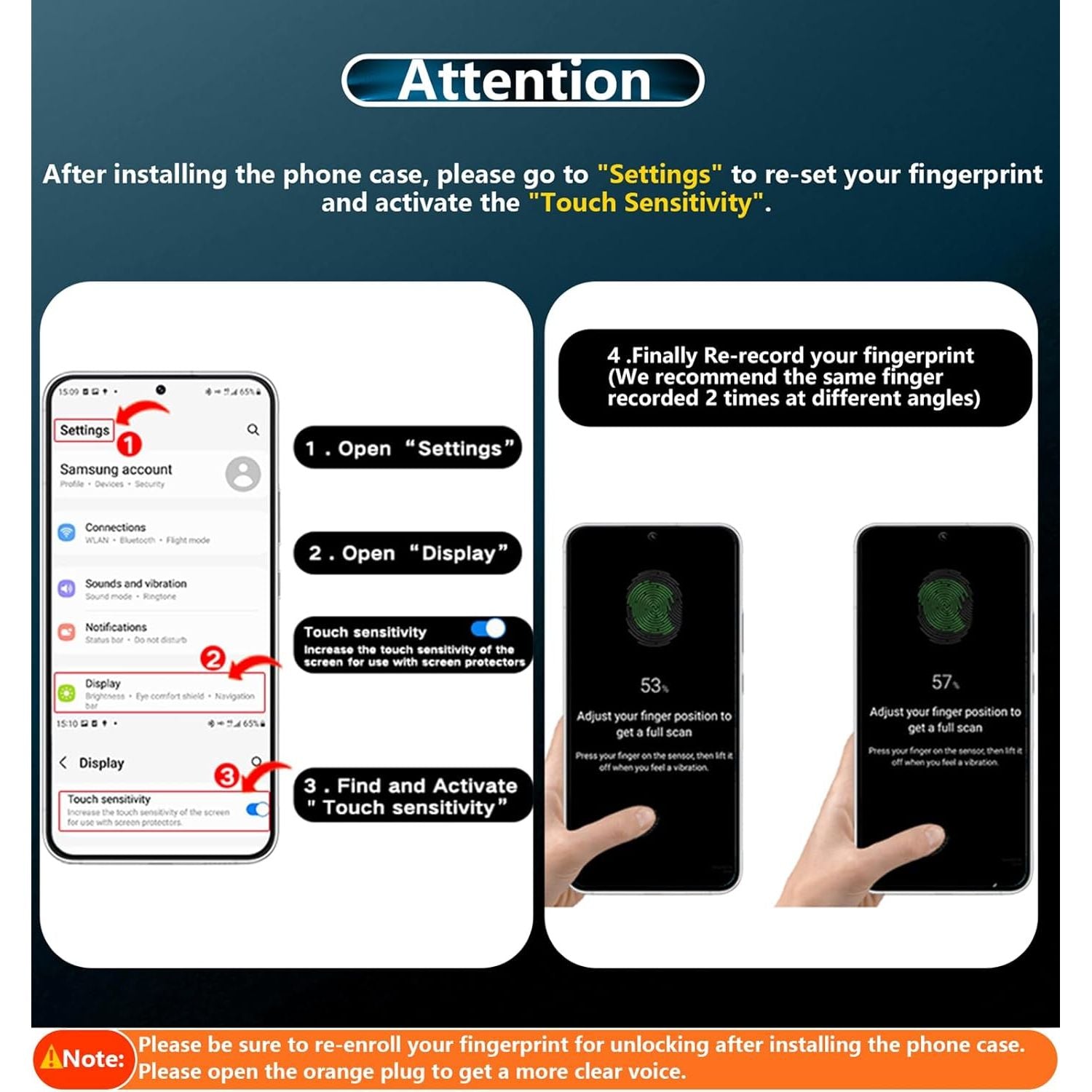 • 【Installing the Case & Re-Setting Fingerprint Unlock】To avoid the phone blocks the voice of the phone, please open the charging port on the bottom of the phone. And to get the fingerprint unlock function work, 1. Find the"Settings" 2. Go to "Display" 3. Slide to find "Touch Sensitivity" and click. After installing the phone case, please go to "Settings" to activate the "Touch Sensitivity". Then delete your stored fingerprint, and re-scan your fingerprint repeatedly at different angles. After that, the fingerprint unlocked will works well.