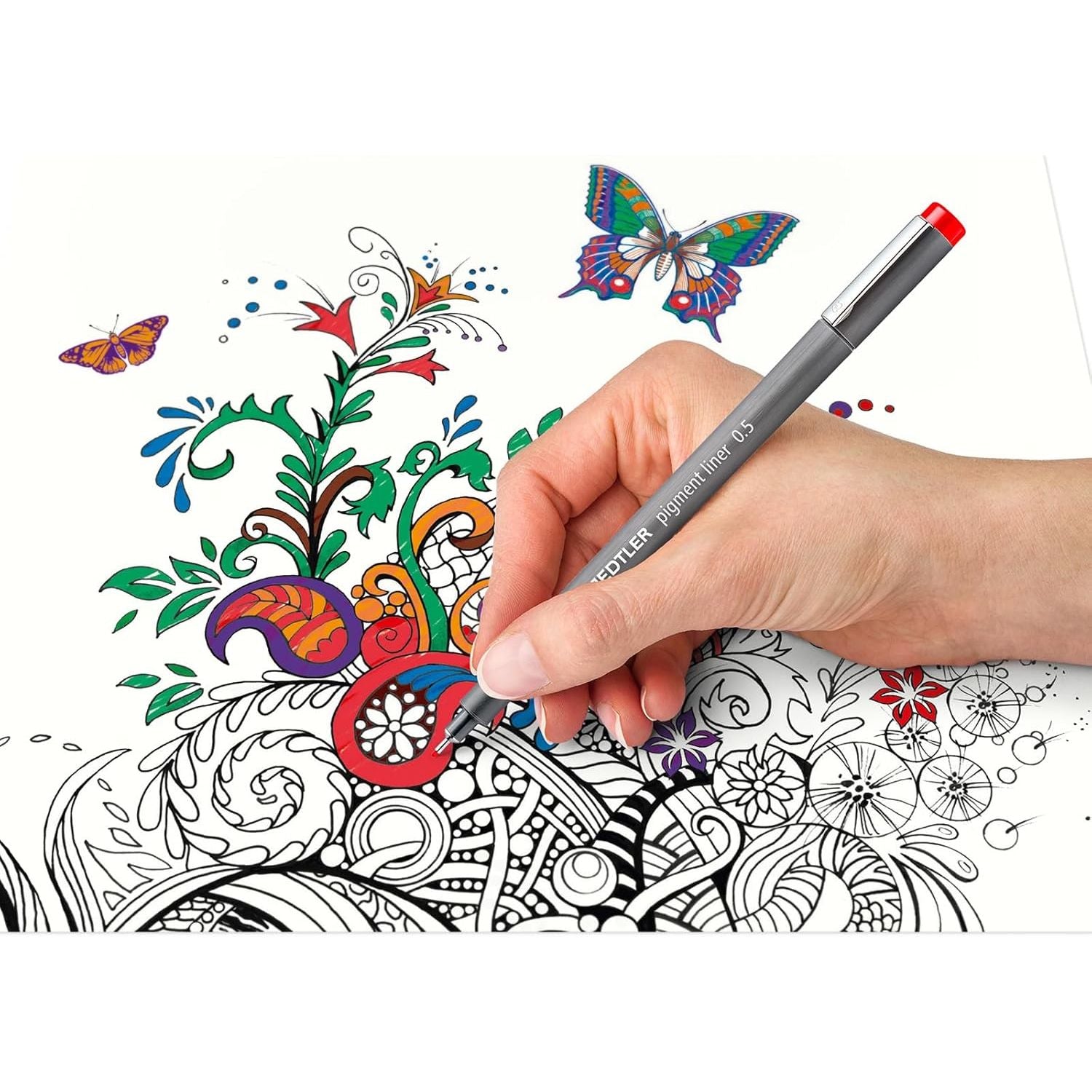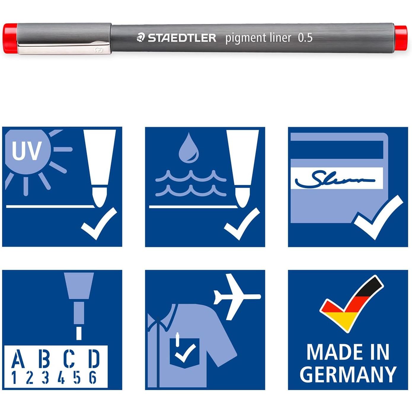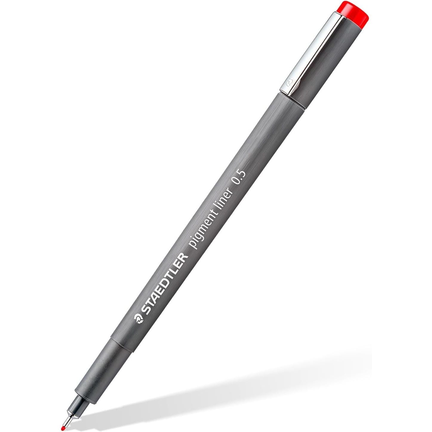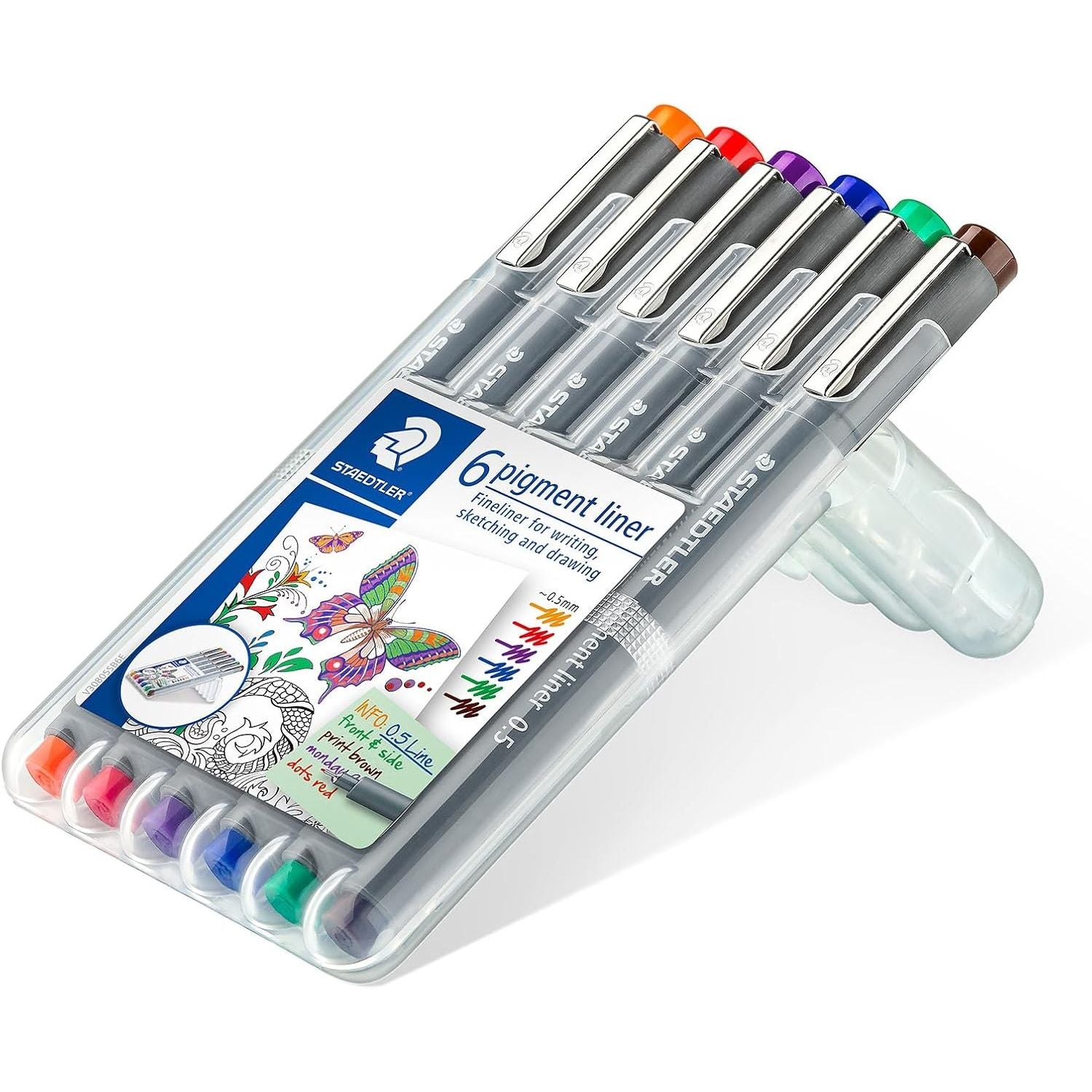 Product Description High-quality fine liner with PP barrel for long service life. Long metal tip, metal clip. Pigment ink, indelible (in accordance with ISO 14145-2), lightfast, erasable when used on drafting paper, no bleeding when highlighted. CAP OFF - can be left uncapped for at least 12 hours without drying up (standard atmosphere according to ISO 554). Barrel colour: grey. Ideal for hand lettering and bullet journaling, creative Zen tangles and mandalas. Set Contains: 6 assorted colours in practical stand-up STAEDTLER box, colours: 2 red, 3 blue, 4 orange, 5 green, 6 violet, 76 brown, 0.5mm line width