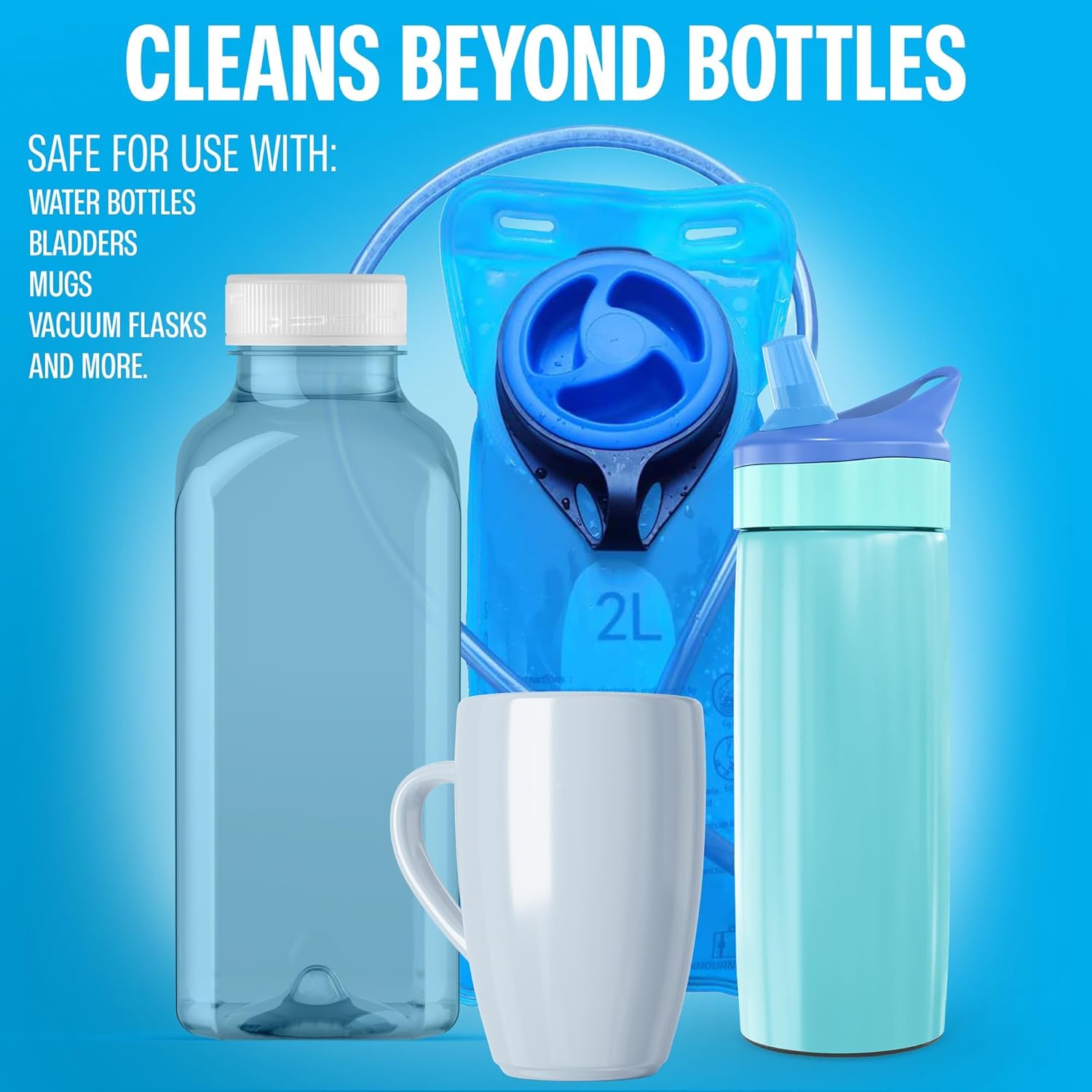- Compatible with a wide range of containers like stainless steel bottles, plastic flasks, hydration packs, and coolers. Whether you’re at the office, on the trail, or at the gym, water bottle cleaner tablets make deep cleaning quick and hassle-free.