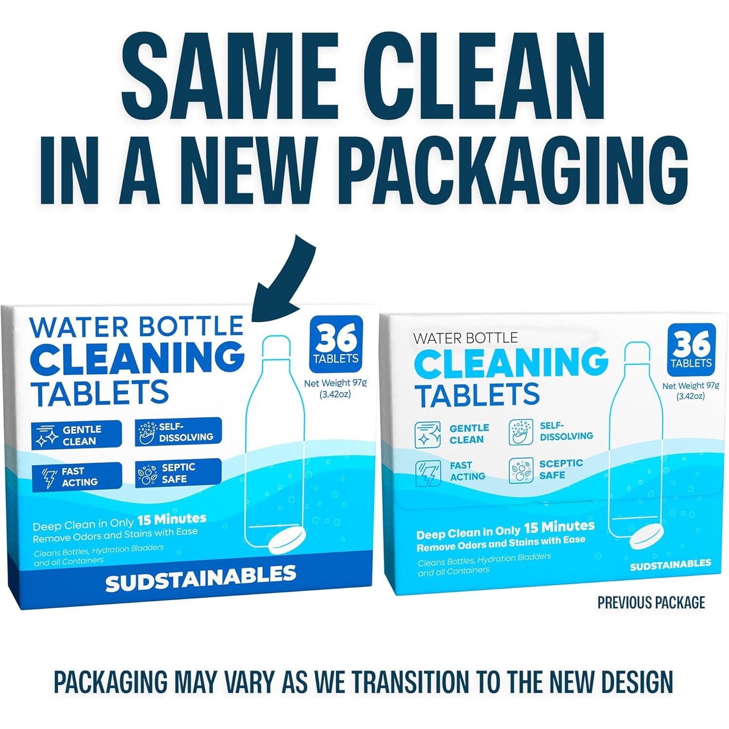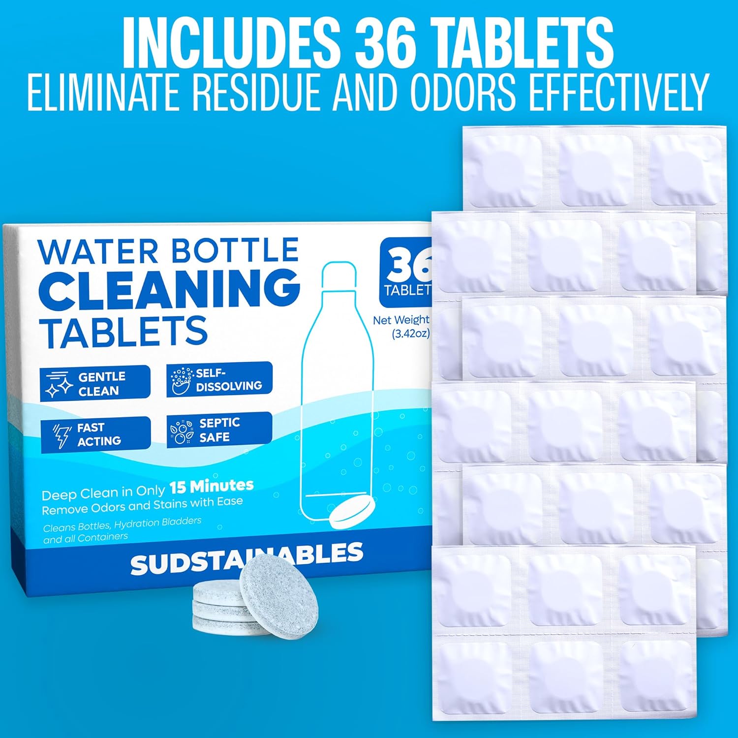 - Sudstainables Water Bottle Cleaning Tablets – 36-Pack | Chlorine-Free & Odor-Control Formula | Water Bottle Cleaner, Flasks, Hydration Packs & Travel Mugs | Washer Tablets for Home, Hiking & Camping