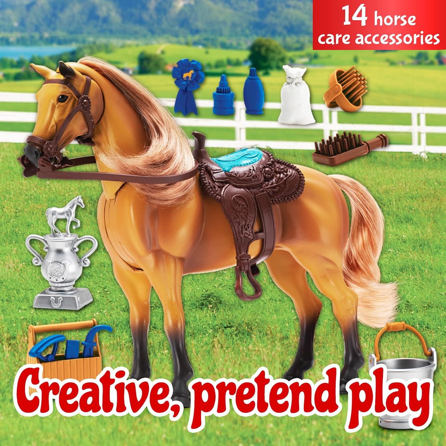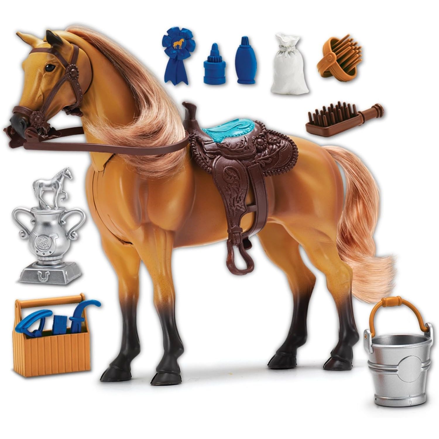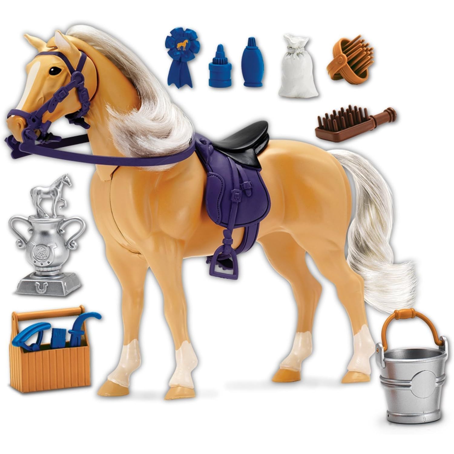 - 14 PIECE PLAYSET: Comes complete with everything you need to win the blue ribbon for best in show with 14 horse-care accessories, including a cup, a wooden case, a handle brush, and more. There is even a detachable saddle for more life like play.