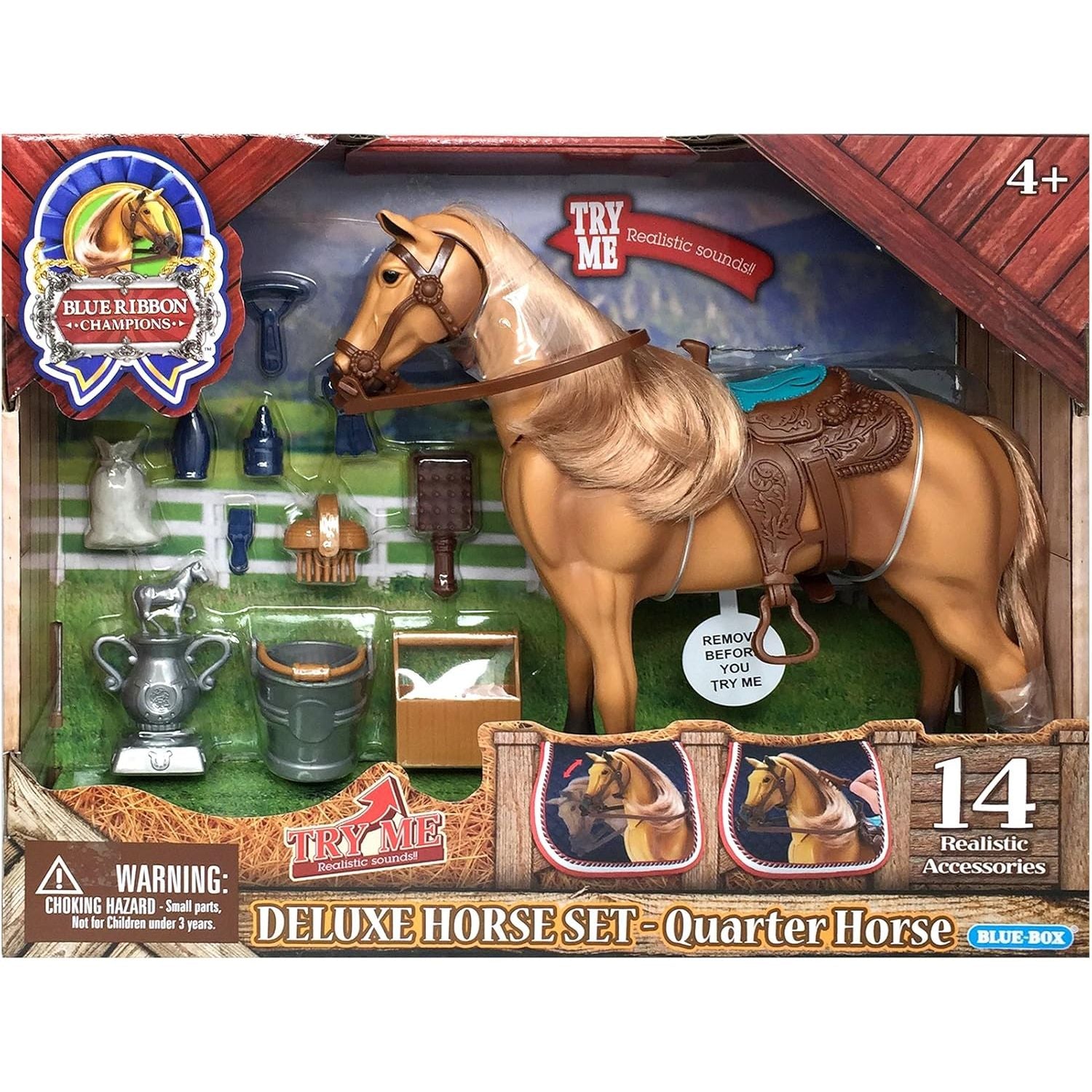 Saddle up for hours of great fun and happy trails with the Blue Ribbon Champions Deluxe Quarter Horse. Horse lovers of all kind will admire the movable head, brushable mane and tail, and the life-like sounds that come with this toy. The removable saddle, feeding accessories, and toy brushes add to the adventures of caring for this horse toy. Mix with other toys and stable sets or use it on its own. Junior equestrians will love to prance and gallop with this this fun toy horse, then move the head to hear realistic sounds. Realistic detailing and strong construction make it a favorite for horse enthusiasts of all ages!