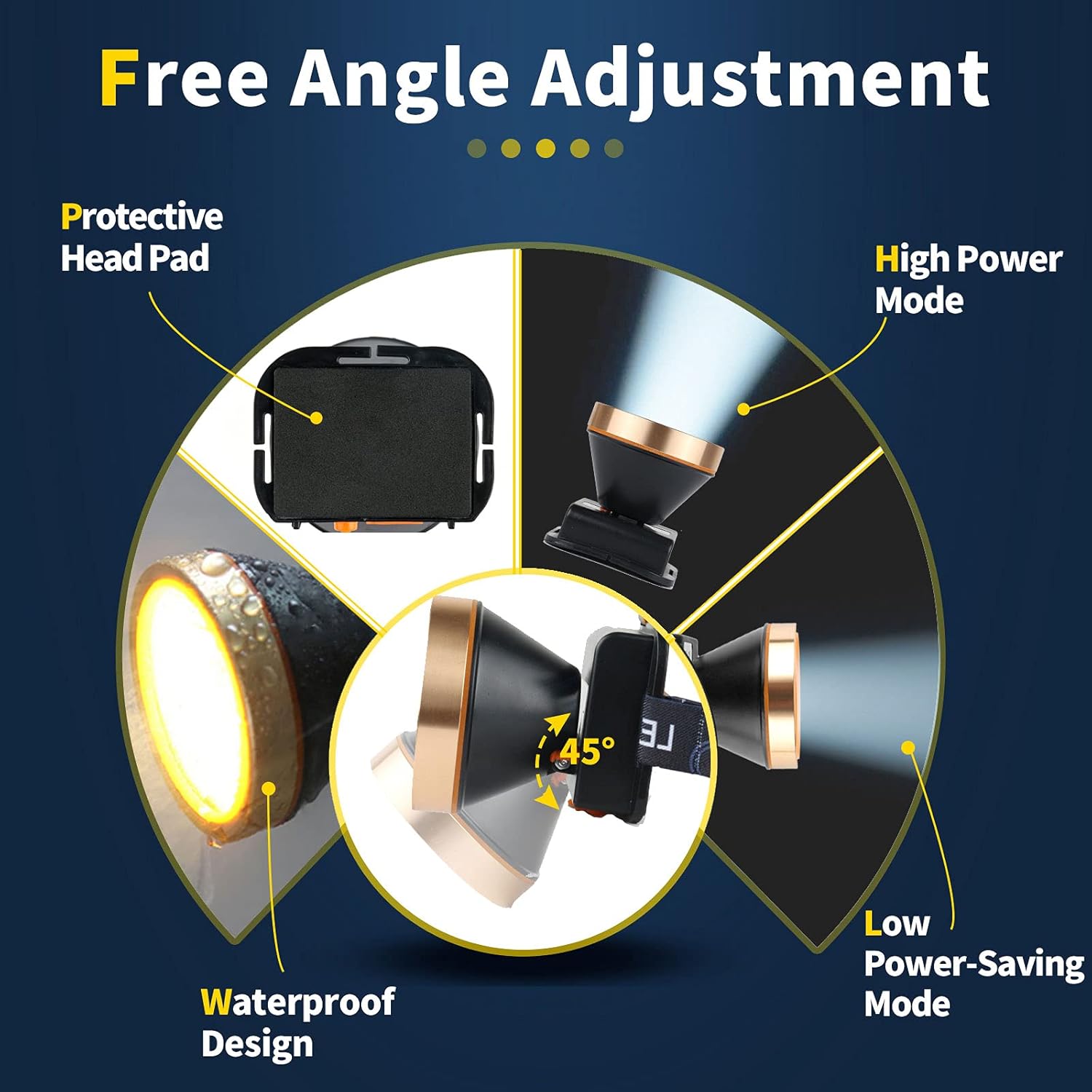 - ✦ Durable Waterproof Design – Built to handle complex outdoor conditions, this waterproof headlamp is perfect for rain, fog, or rugged work environments. The 45° adjustable lamp head lets you easily control the lighting angle, providing hands-free illumination exactly where you need it.
