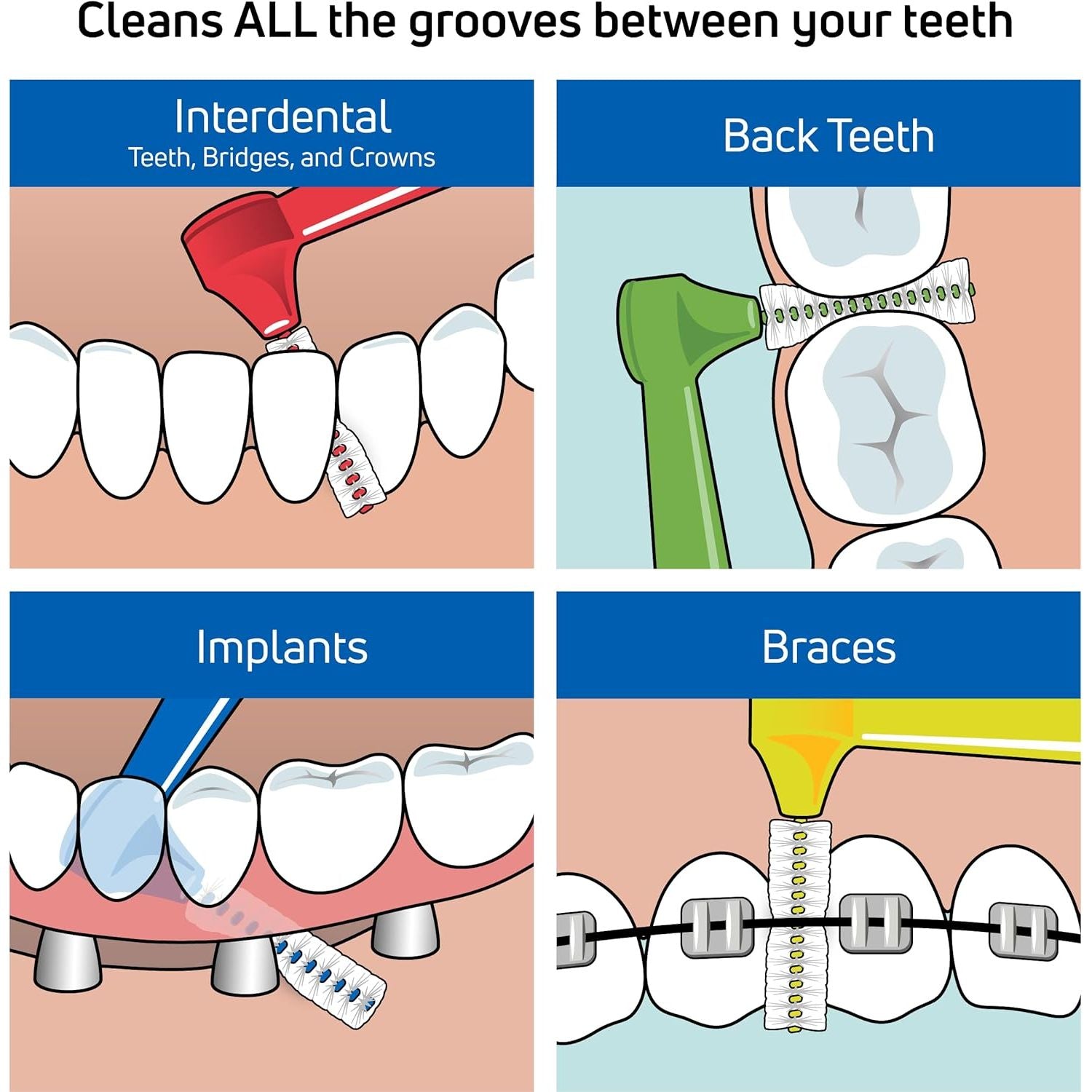 - VERSATILE TEETH BRUSH: The angled head cleans plaque that toothbrushes leave behind, and the long ergonomic handle offers total stability and movement control to reach tight spots between back teeth, braces, implants, crowns, and bridges.