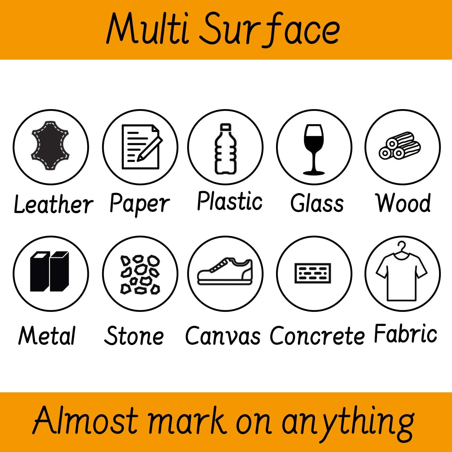 -These paint pens will write on the following surfaces glass, paper, cardboard, fabric, rubber, plastic, canvas, metal, aluminium, brass, cars, wood, stone, crafts etc.