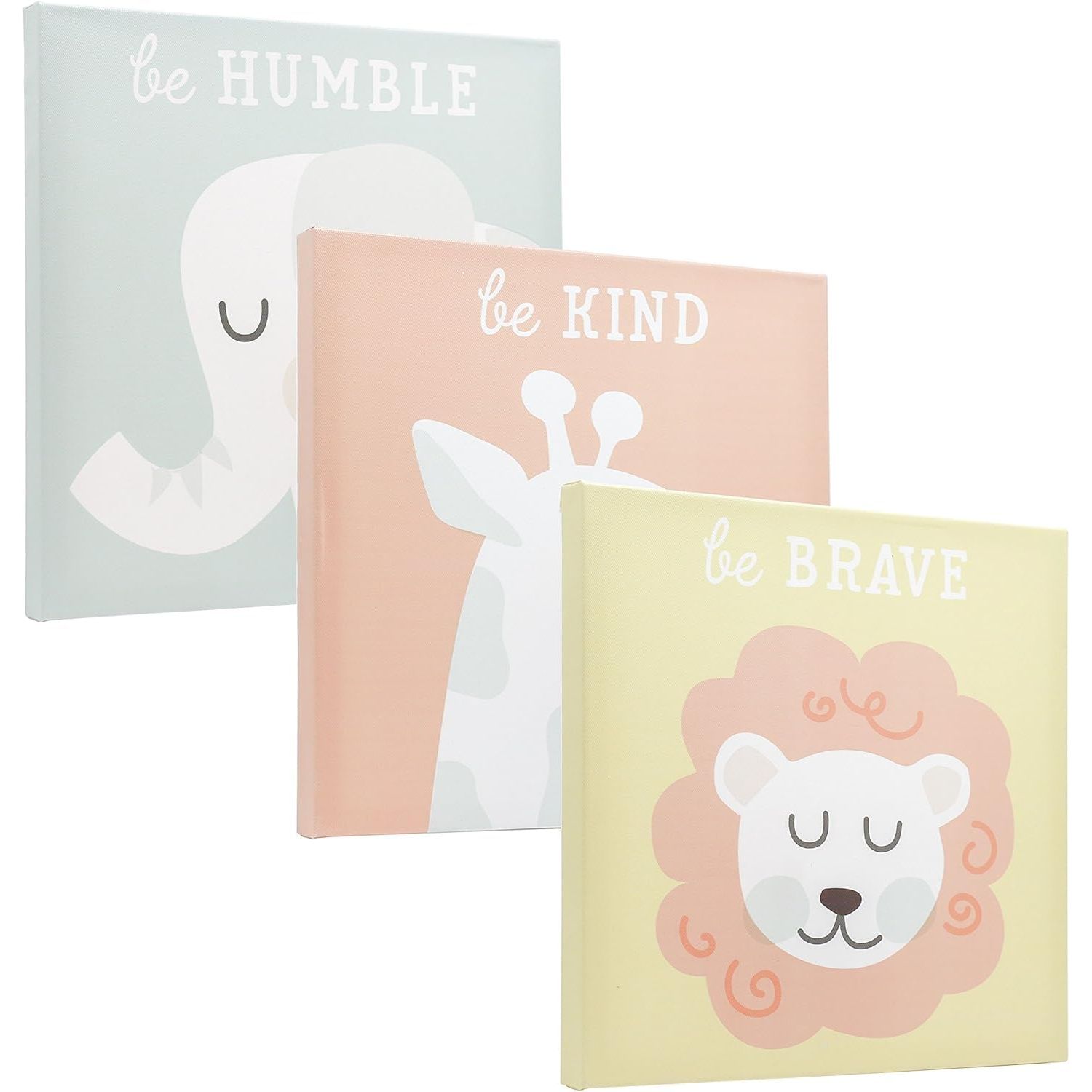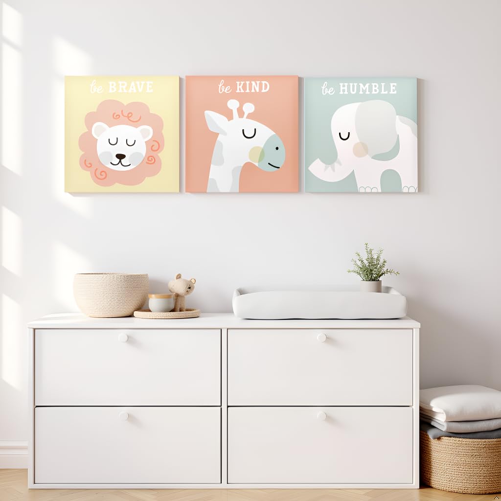 - Charming Nursery Wall Art: Includes three 12" x 12" canvas prints, each featuring a sweet animal illustration with an inspirational saying—Elephant “Be Humble,” Giraffe “Be Kind,” and Lion “Be Brave.”