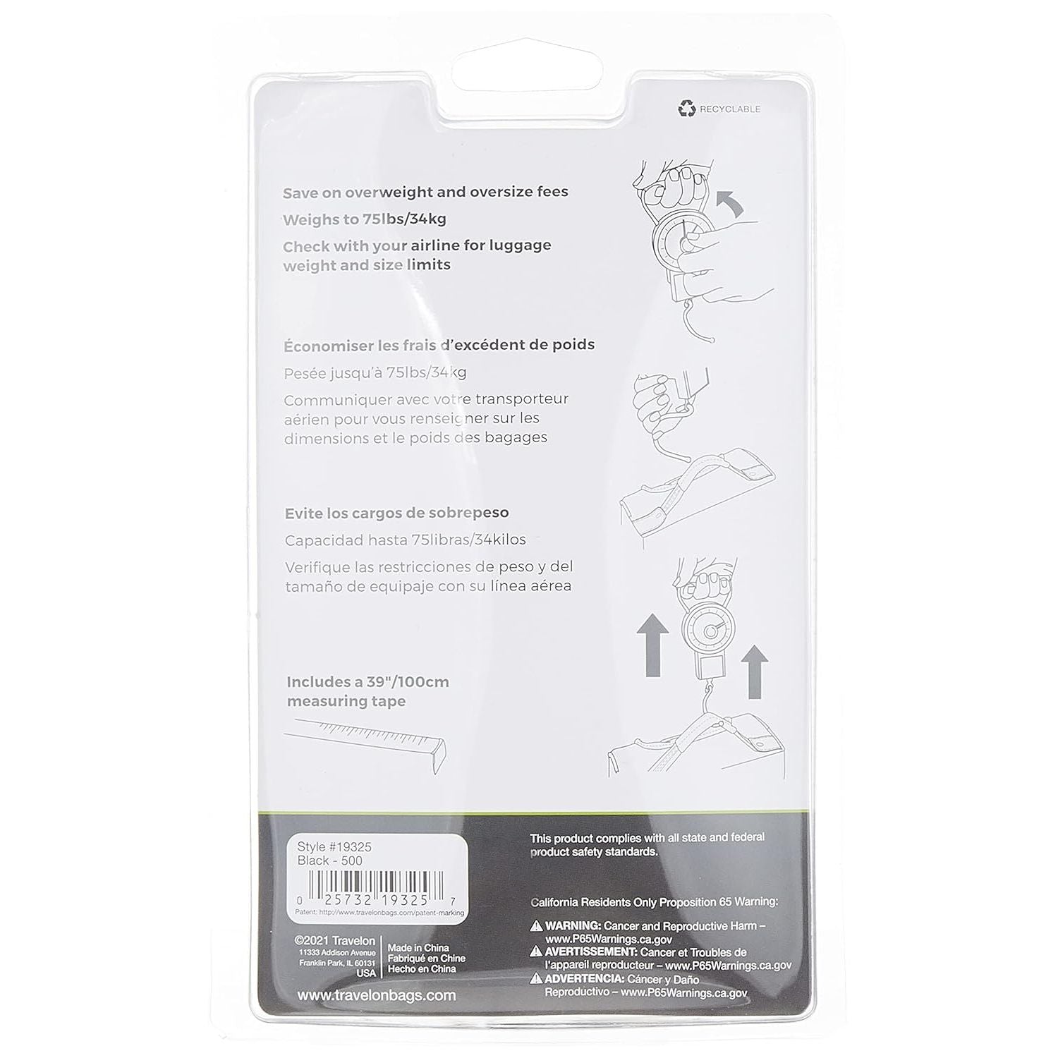 Product Description The Stop-N-Lock Luggage Scale from Travelon allows for a simple affordable solution to eliminate pre-trip packing guesswork and hefty overweight luggage fees. This easy to use luggage scale has a patented stop and lock feature. Two hands track the weight of the bag and the second hand stops and locks at that weight so you can set the suitcase down to read the dial. It also includes a tape measure to also ensure bags are not oversized. Take it with you on your trip to ensure you don't tip the scales on your way back From the Manufacturer Travelon has been making travel easier for nearly 30 years with fashionable, functional products that are designed and built to last.