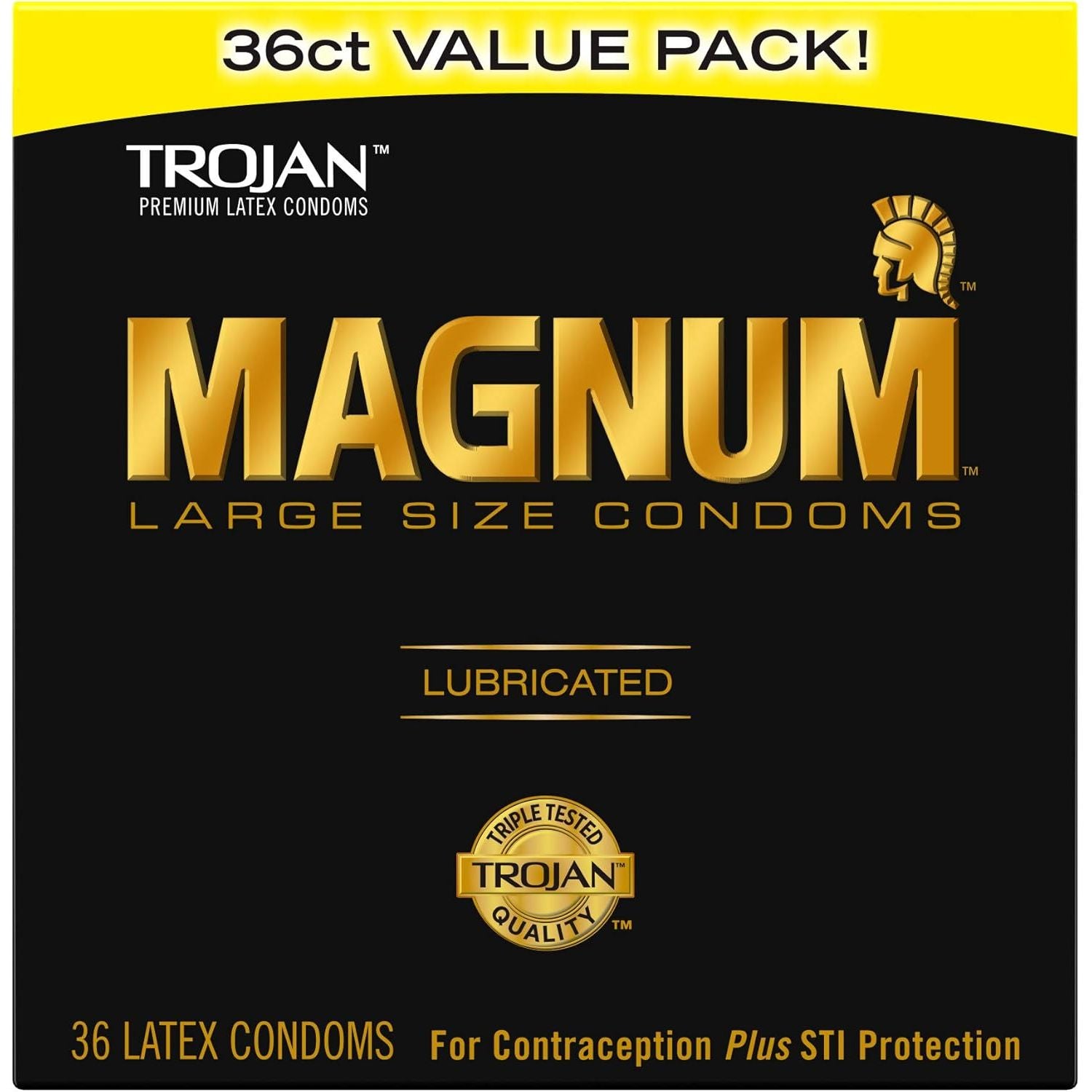 Enjoy larger than life pleasure with TROJAN Magnum Large Condoms. These lubricated condoms are larger than the standard latex condom, offering a wider, contoured shape for added comfort and a tapered base to ensure a secure fit. With silky-smooth lubricant for comfort and sensitivity, each of these lubricated condoms for men is made from premium-quality latex and is electronically tested to help ensure reliability. These large condoms also feature a reservoir tip for extra safety, so you can enjoy the moment without worry. TROJAN Brand Condoms reduce the risk of unintended pregnancy and sexually transmitted infections (STIs) while you play. Each box of condoms includes 36 TROJAN Magnum Condoms large size. Magnum: The gold standard. Accept no substitutes. TROJAN Brand Condoms are America's Number 1 Condom, trusted for over 100 years. TROJAN promotes a safe, healthy, and fun sex life. From condoms to vibrators to lubricants, TROJAN is dedicated to delivering innovative, high-quality products that offer pleasure and protection. Product is HSA/FSA eligible. When used correctly, condoms are unlikely to break. To prevent breakage, do not use condoms after the expiration date, keep in a cool, dry place, and use water or silicone-based lubricants for latex condoms.