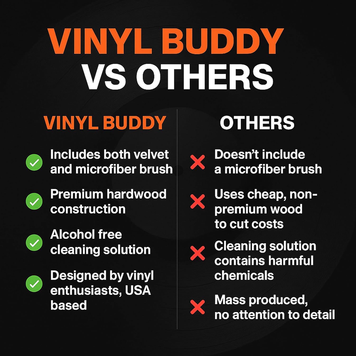 Unlike generic cleaning kits, Vinyl Buddy is designed by collectors, for collectors. We use premium materials and include only what actually works. Every brush, cloth, and solution is chosen to safely clean and preserve records without unnecessary gimmicks.