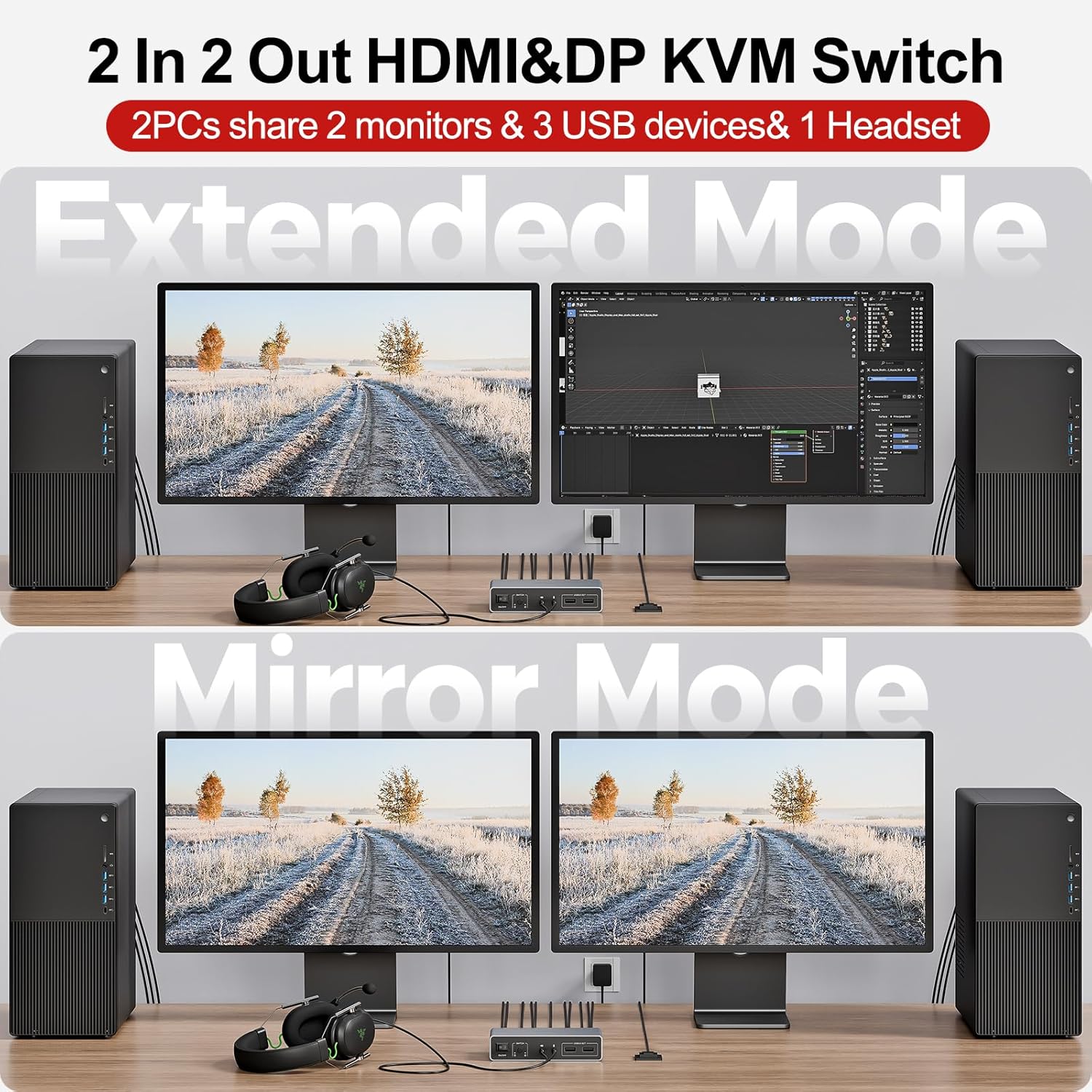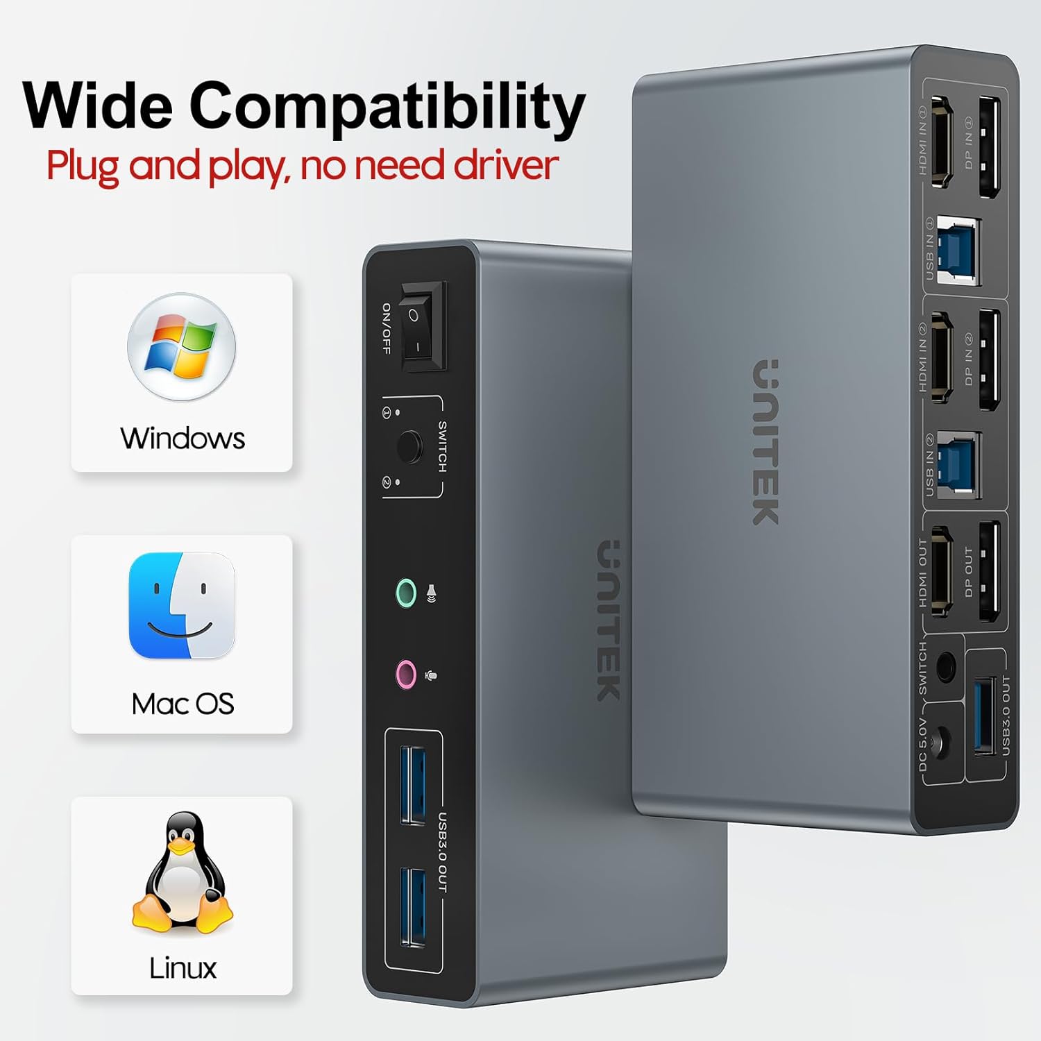 - 【DP HDMI 2 IN 2 OUT KVM Switch 】The Unitek DP HDMI KVM Switch lets you connect two computers to dual monitor and 3 USB 3.0 devices, such as a keyboard, mouse, hard drives, U disk, and printer. This KVM switch is also compatible with a wide range of input devices, including PCs and even PS4, and supports multiple operating systems like Windows 7/8/10/11/Vista/XP, Linux, Mac, and more.Mic and headset port support more function.