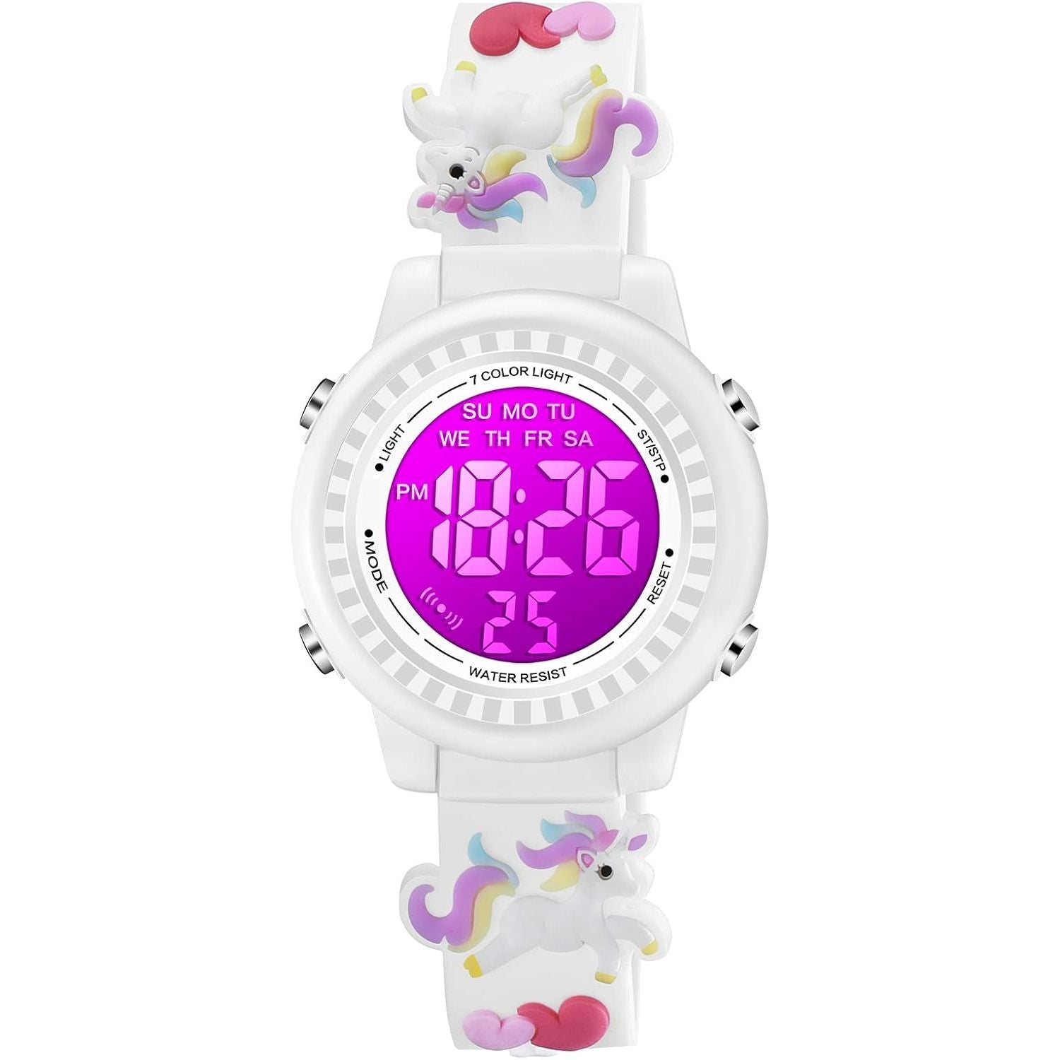 - Upgrade Innovation: 3D cute cartoon strap design with 7 colorful LEDs digital display. Each cartoon image is lively and interesting, 7 different led lights changed, all that make kids very vigorous and happy.