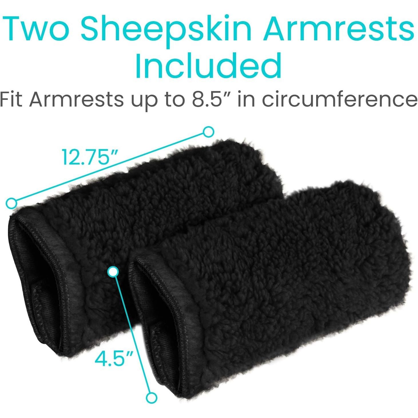 Measuring 12.75" in length, our Cushioned Sheepskin Armrest Pads fit anything with a circumference of 8.5" or less. They fit standard wheelchairs, electric wheelchairs, transport chairs, mobility scooters, and a wide range of handicapped items.