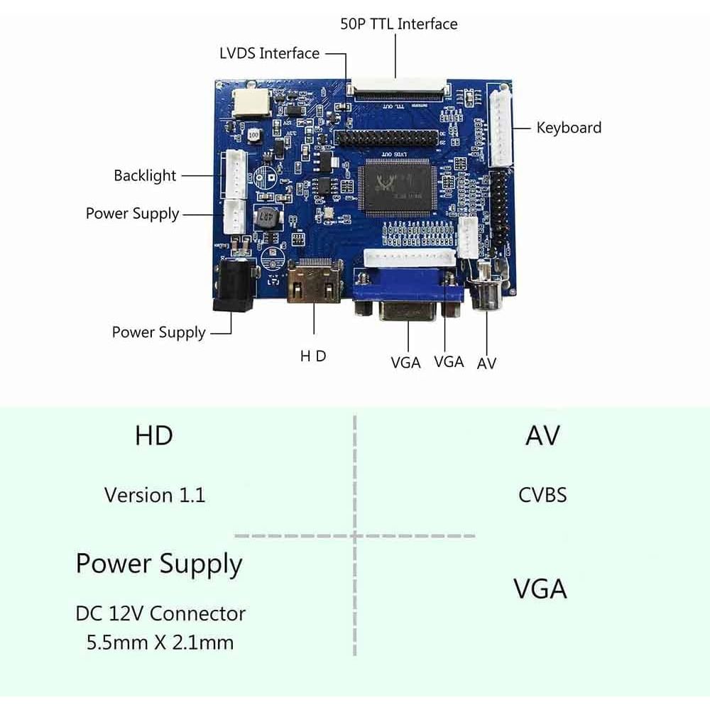 Compatible Work With: 14inch 1366*768: LTN140AT02 LTN140AT07 LP140WH1 BT140XW02 HT140WXB HSD140PHW1 N140B6 B140XW01 B140XW02 B140XW03 LP140WH1 LP140WH3-TL LP140WH4-TL 15.6inch 1366x768 LTN156AT17 LTN156AT02 LTN156AT24 LP156WH2 LP156WH4 BT156GW02 N156B6 B156XTN03 B156XW02 B156XW04 LCD Controller Board: VGA 2AV LCD Board Work for LVDS Interface LCD Screen 50Pin TTL Connector for 7inch~10.1inch LCD Screen Input Power Adapter:12Vdc More than 2A. Come In Standby Model When Not Input Signal Standby Model <1W Video Input: VGA AV1 AV2 Reversing: Support Automatically Switch To AV2 When Connector ACC to 12V OSD: Brightness Contrast Auto Language And So On Language: English French German Spanish Italian And So On Board Size:91mm x 66mm x 12mm Packing list : 1× VGA+2AV LCD Controller Board VS-TY2662-V1 1× 40Pin Signal Cable 1× Keyboard With Cable 1× Remote Control(Battery Not included)