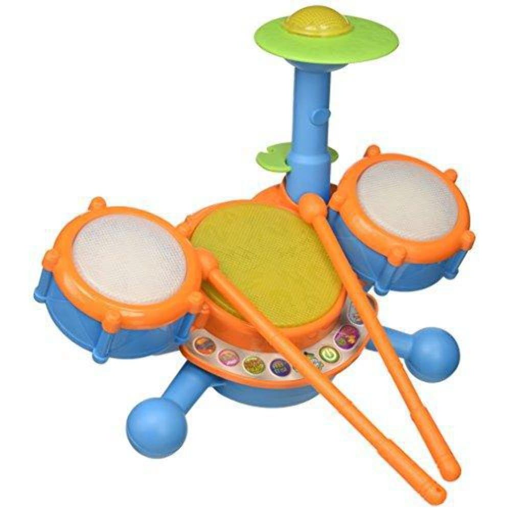 Product Description Perform like a star with the KidiBeats Drum Set. Tap the three light-up drum pads and cymbal with the included drumsticks to hear each of their unique sounds for sensory development. Play along to built-in melodies in a variety of styles including rock, dance, pop or in your own style to encourage musical creativity. Four play modes include Free Play, Letters, Numbers and Follow Along. Brand Story By VTech P.when('A').execute(function(A) { A.on('a:expander:toggle_description:toggle:collapse', function(data) { window.scroll(0, data.expander.$expander[0].offsetTop-100); }); }); From the Manufacturer Your child can rock out and learn with the VTech KidiBeats Drum Set. This drum set for kids comes with a pair of drumsticks that can be used to tap the four different electronic learning drums. Your child can drum freestyle or play along to nine pre-set melodies in a variety of musical styles. Or for more structured play, they can follow the lights on the drums as they learn about letters and numbers. With four ways to play and a variety of fun sounds, your child will love learning to the music with this educational toy. See more