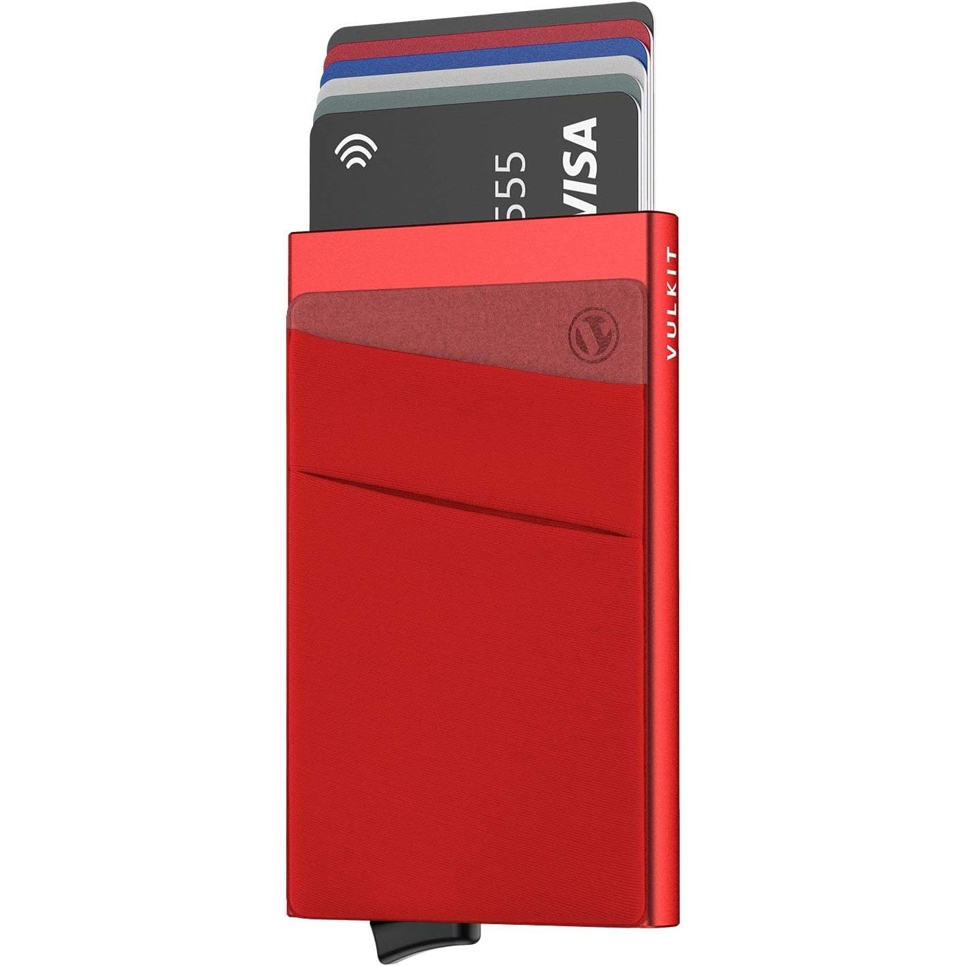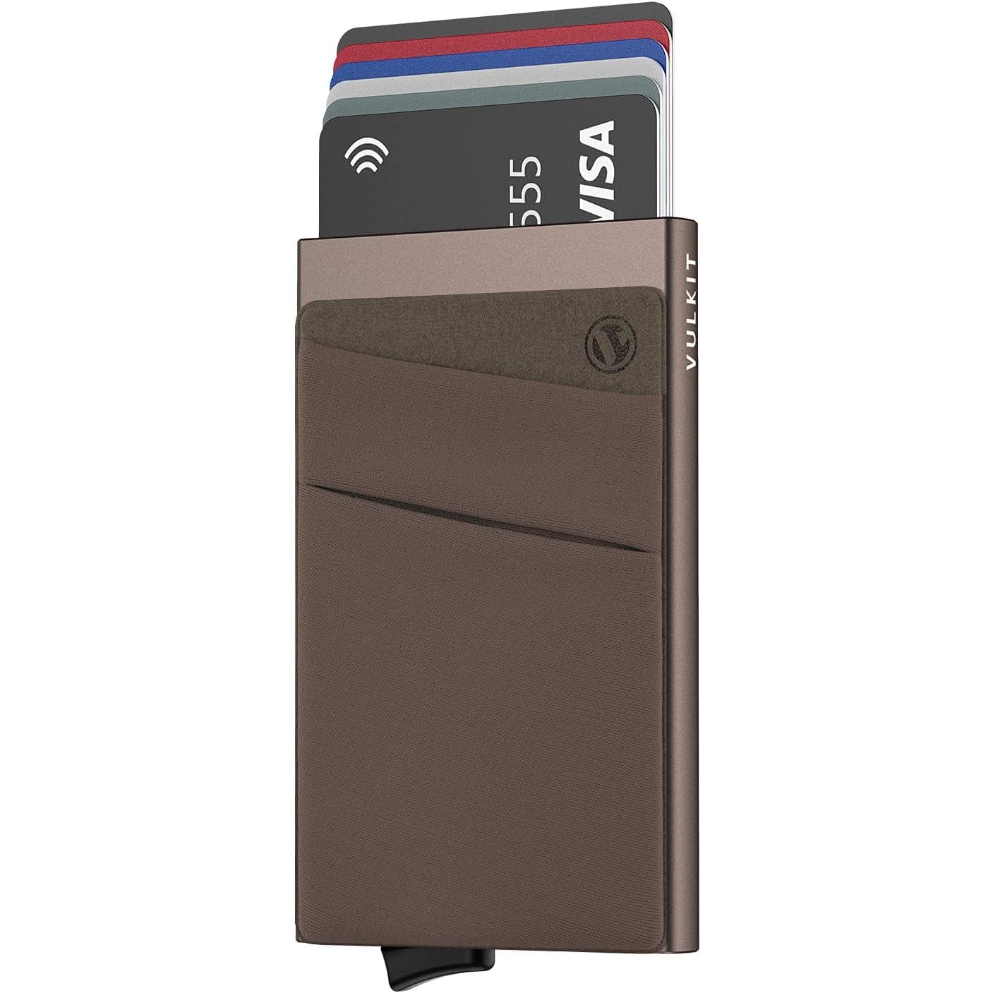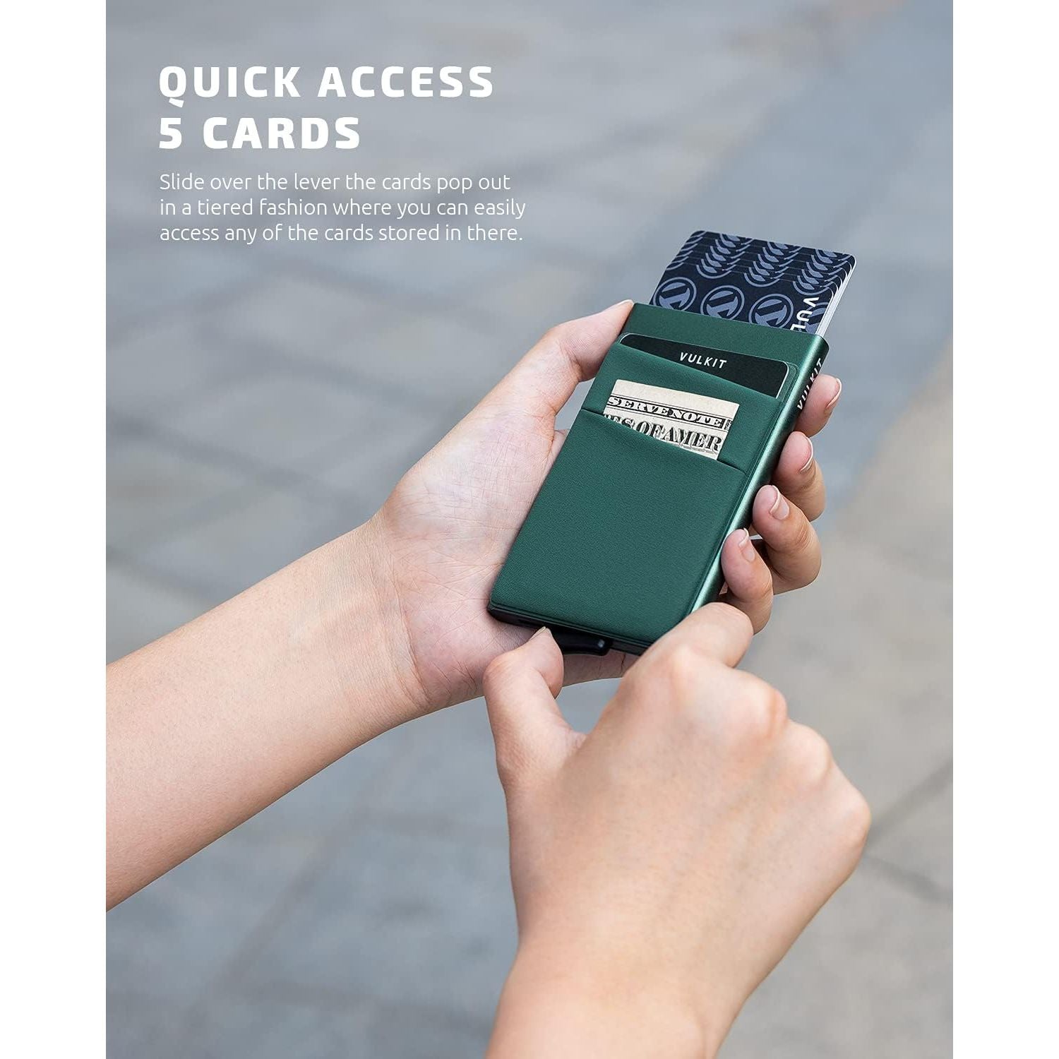 VULKIT Elegant Minimalist Card Holder Instead of a traditional bulky wallet, the slim and lightweight design brings you a new experience. Features: - Length: 10 x 6.3 x 0.8 cm. - Weight: 53 g. - Holds 5 cards Extra pocket for money. - RFID and NFC blocking - Quick access