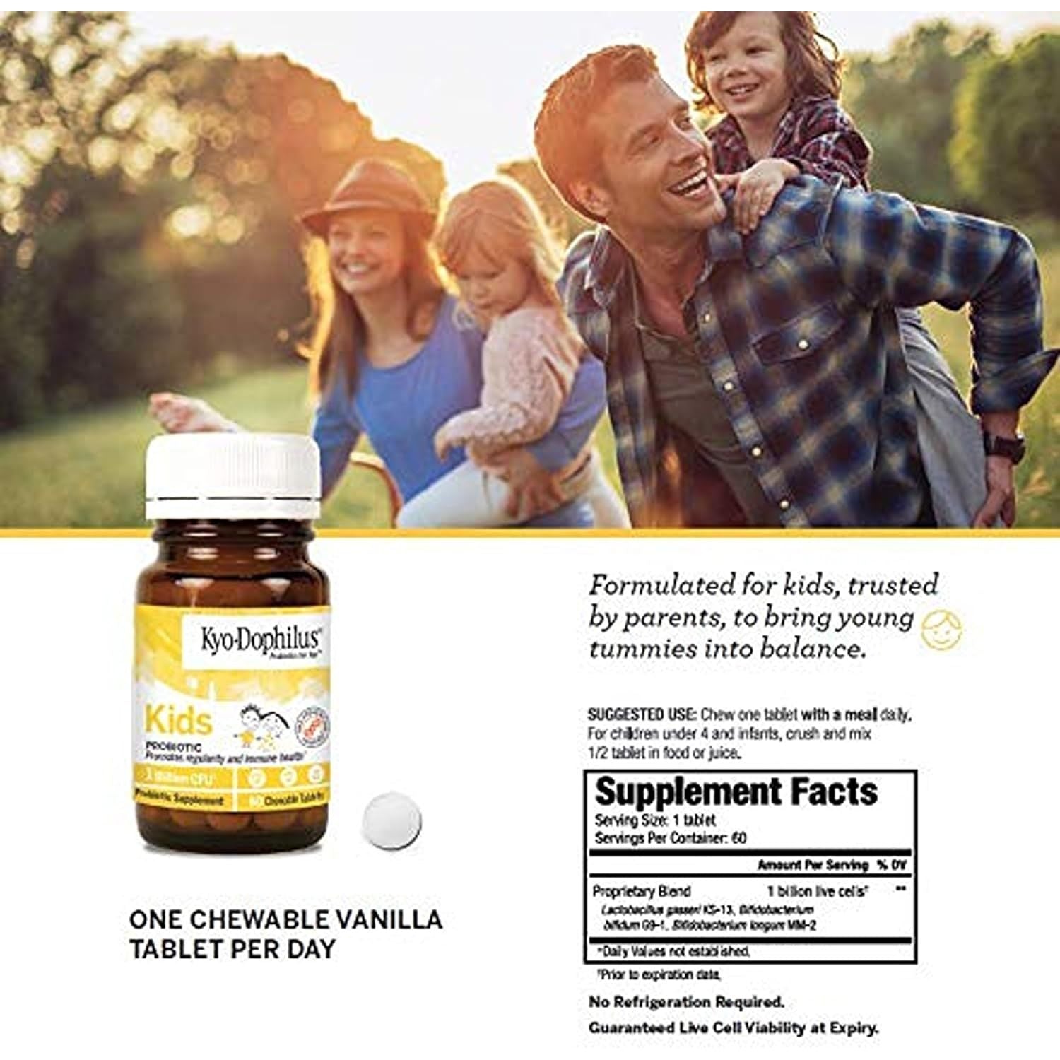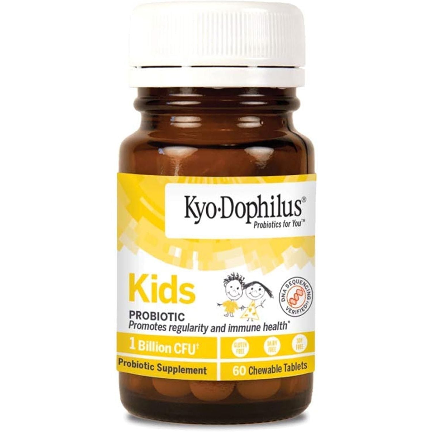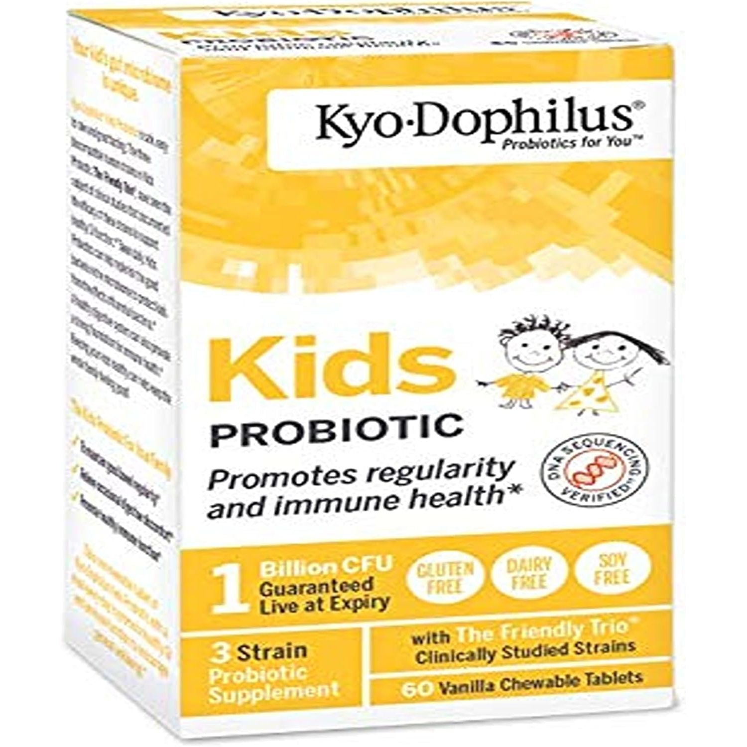 Kyolic Kid's Kyo-Dophilus. Description: Supports healthy intestinal function. Probiotic supplement. Half billion live cells per tablet. Vegetarian. Children are very special people. Any change in diet or even antibiotic usage can upset their delicate digestive systems. So supplement their diet with the safe and effective, specially cultured strain of acidophilus found in Kid's Kyo-Dophilus. The acidophilus in Kid's Kyo-Dophilus is uniquely processed to retain viability at room temperature insuring adequate numbers for implantation in the intestine and is essential in maintaining healthy intestinal flora. Kid's Kyo-Dophilus requires no refrigeration. Free of Preservatives, sodium, milk, yeast, gluten, artificial colors. Disclaimer These statements have not been evaluated by the FDA. These products are not intended to diagnose, treat, cure, or prevent any disease.