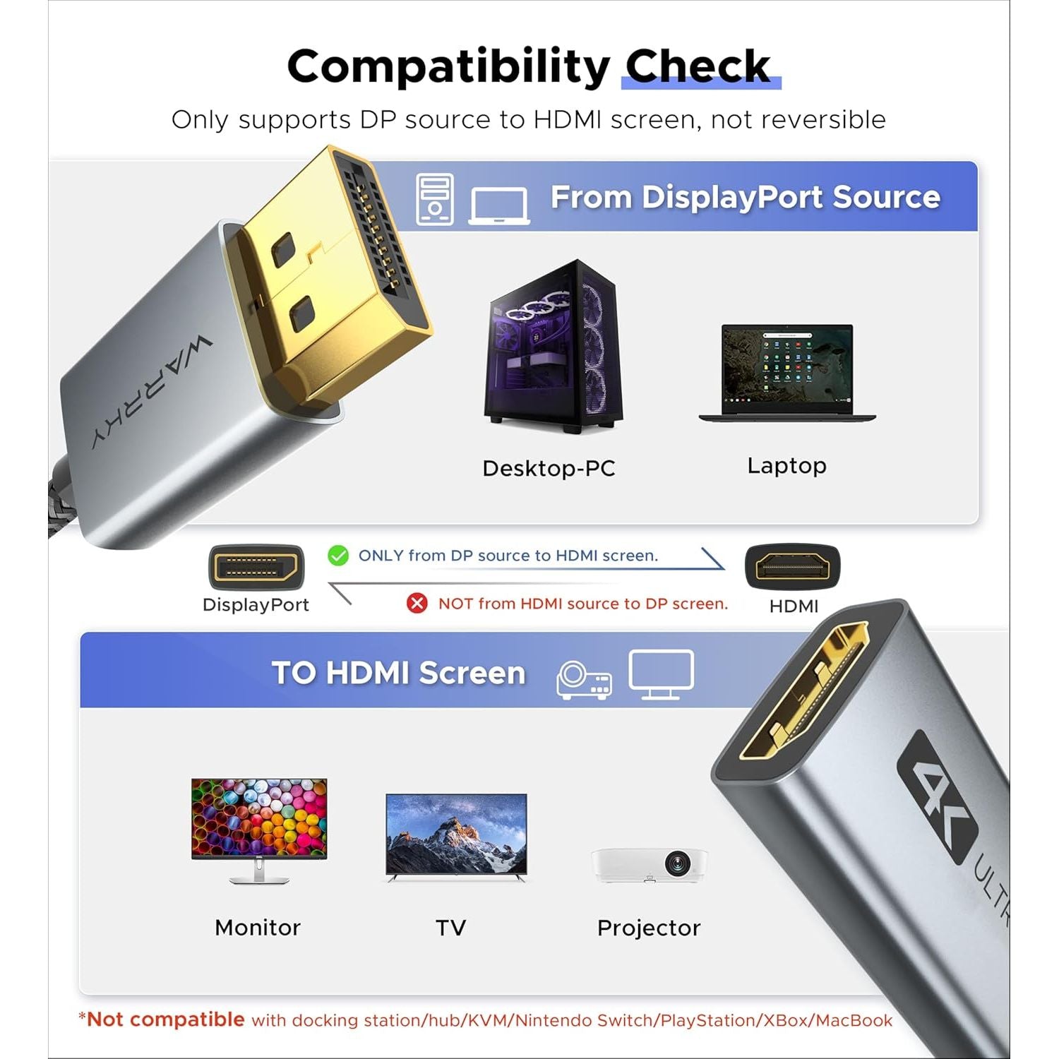 - Warrky 4K DisplayPort to HDMI Adapter, Uni-Directional [Metal Case, Gold-Plated Pins] Display Port Source to HDMI Monitor Converter 1080P@120Hz Compatible for HP, AMD, NVIDIA. Male to Female