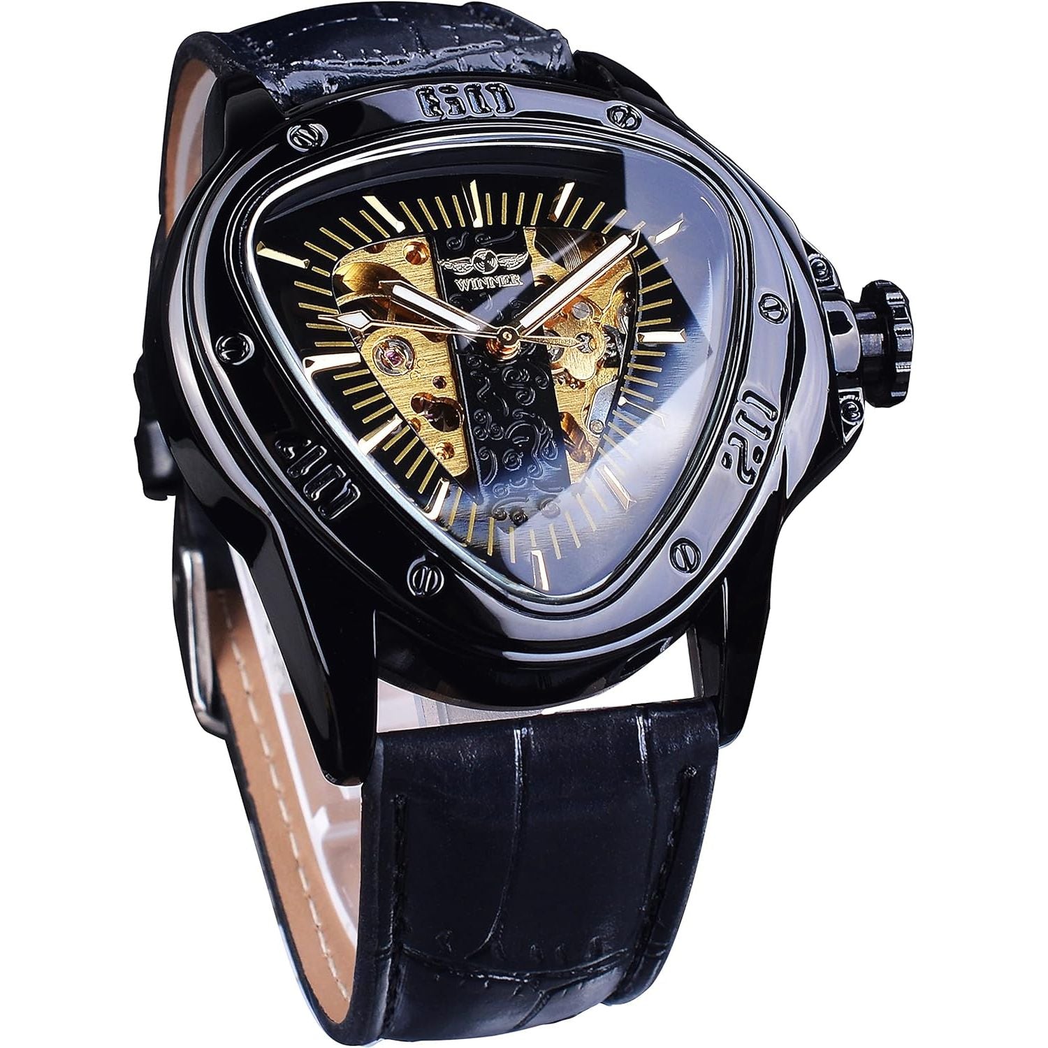 Winner Fashion Mechanical Wrist Watch Triangle Racing Dial, Waterproof Golden Skeleton Dial Automatic Movement Leather Design Mechanical Watch for Men